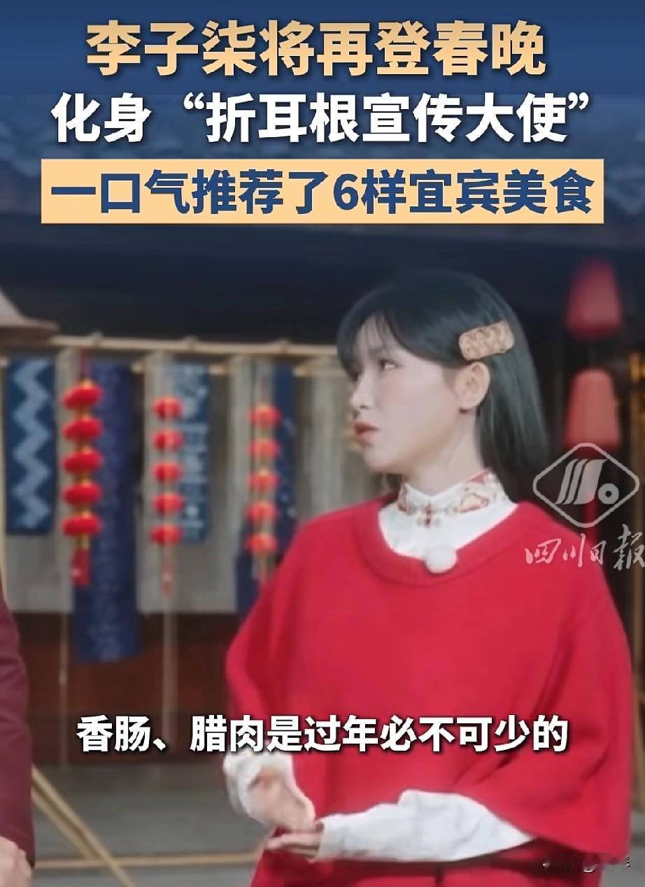 哇塞,超喜欢李子柒!✨ 这次她在2026年央视春晚宜宾分会场的亮相,真的太让人期待了。 在央视《出发春晚》的采访里,她化身“折耳根宣传大使”,和主持人玩起了“香肠、腊肉、折耳根”的RAP,还一口气推荐了6样宜宾非遗美食: - 宜宾燃面 - 高县土火锅 - 长宁全竹宴 - 李庄白肉 - 双河凉糕 - 南溪豆腐干 她还说,到了宜宾才发现,这些从小吃到大的美味,原来都是非遗,这份对家乡和传统文化的热爱,真的太打动人了。 李子柒