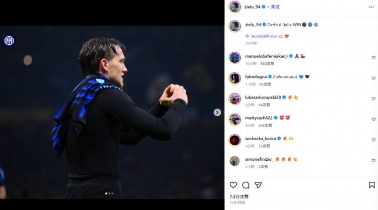 他也在赛后通过社媒晒出自己向妻子示爱的庆祝照,并艾特了对方:“意大利国家德比获胜⚫⚽@_laurazielinska”