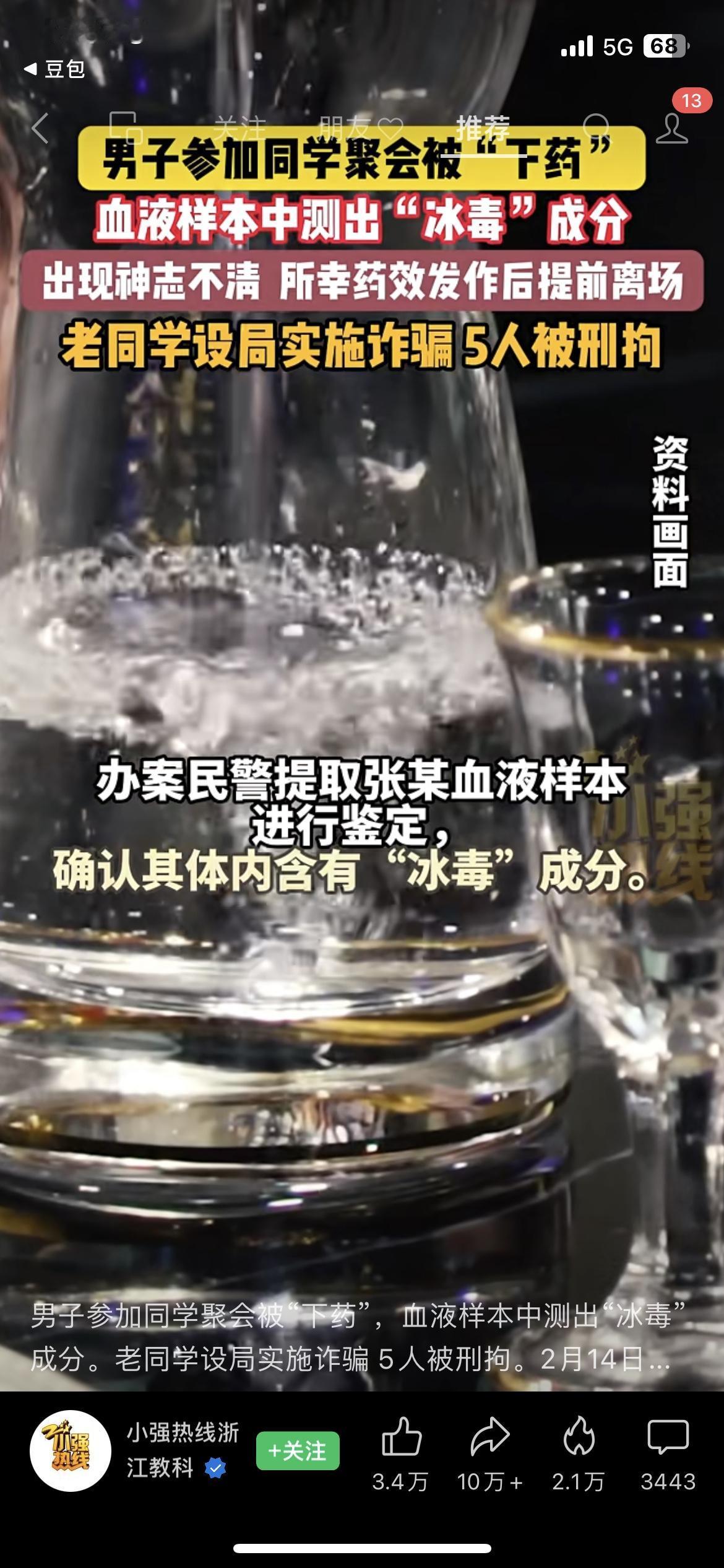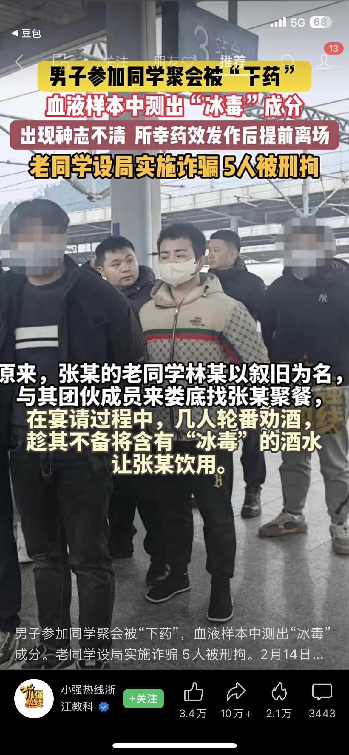 太离谱了!熟人作案才最防不胜防! 湖南娄底的张先生,被老同学以叙旧为名约聚餐,饭桌上几个人轮番劝酒,趁他不注意,往酒里加了冰毒! 之后张先生直接神志不清、意识模糊,幸好提前离场没让对方的诈骗骗局得逞,报警后血检果然测出了冰毒成分,目前5个嫌疑人已经全部被刑拘。 年底年初聚会多,给所有人提个醒:离开视线的酒水千万别喝,劝酒太凶的局,一定要多留个心眼! 你遇到过这种离谱的局吗? 同学聚会 防骗提醒 安全警示 社会热点老同学饭局陷阱 新型毒品陷阱