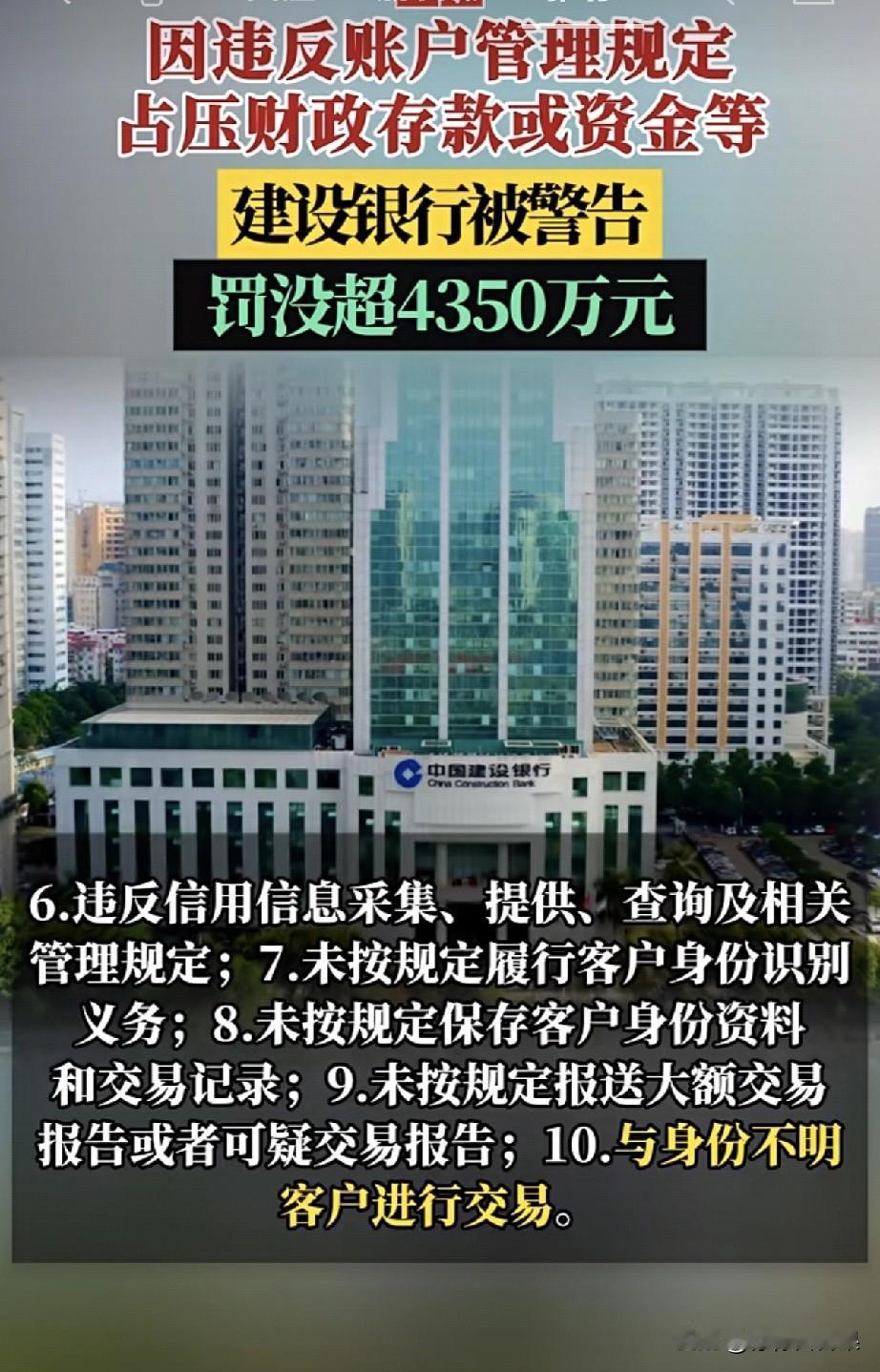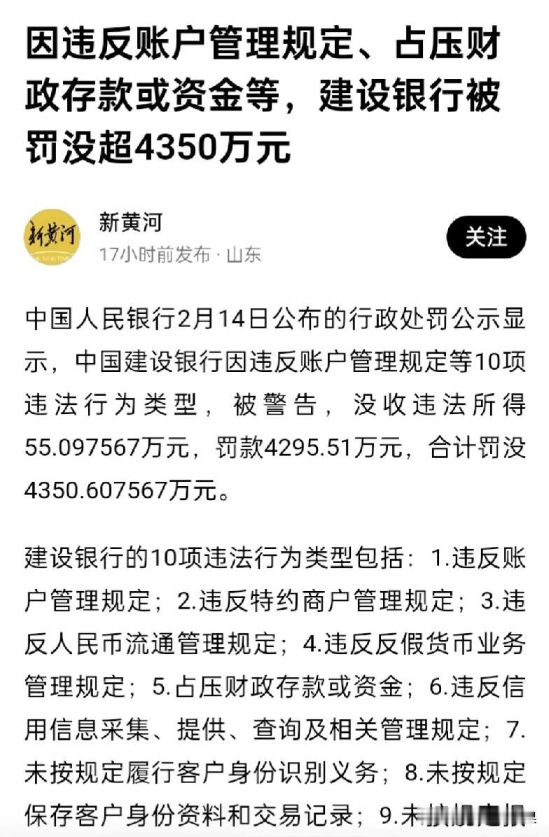 家人们,我刚刷到这个新闻的时候,手里的瓜都掉地上了! 你敢信?咱们平时存钱的建设银行,居然被央行罚了4350万! 4350万啊!这可不是小数目,罚没加起来四千多万,真的惊到我了! 我仔细一看违规内容,直接傻眼,足足10项!账户管理乱、反洗钱没做到位、客户身份没好好识别,甚至还占压财政资金,每一条都看得我目瞪口呆。 本来一直觉得,大银行最稳妥,钱放里面最放心,结果这波操作真的颠覆认知。 这次处罚就是给所有大机构提个醒,不管多大来头,都不能踩红线。 家人们,对于此事你们怎么看?
