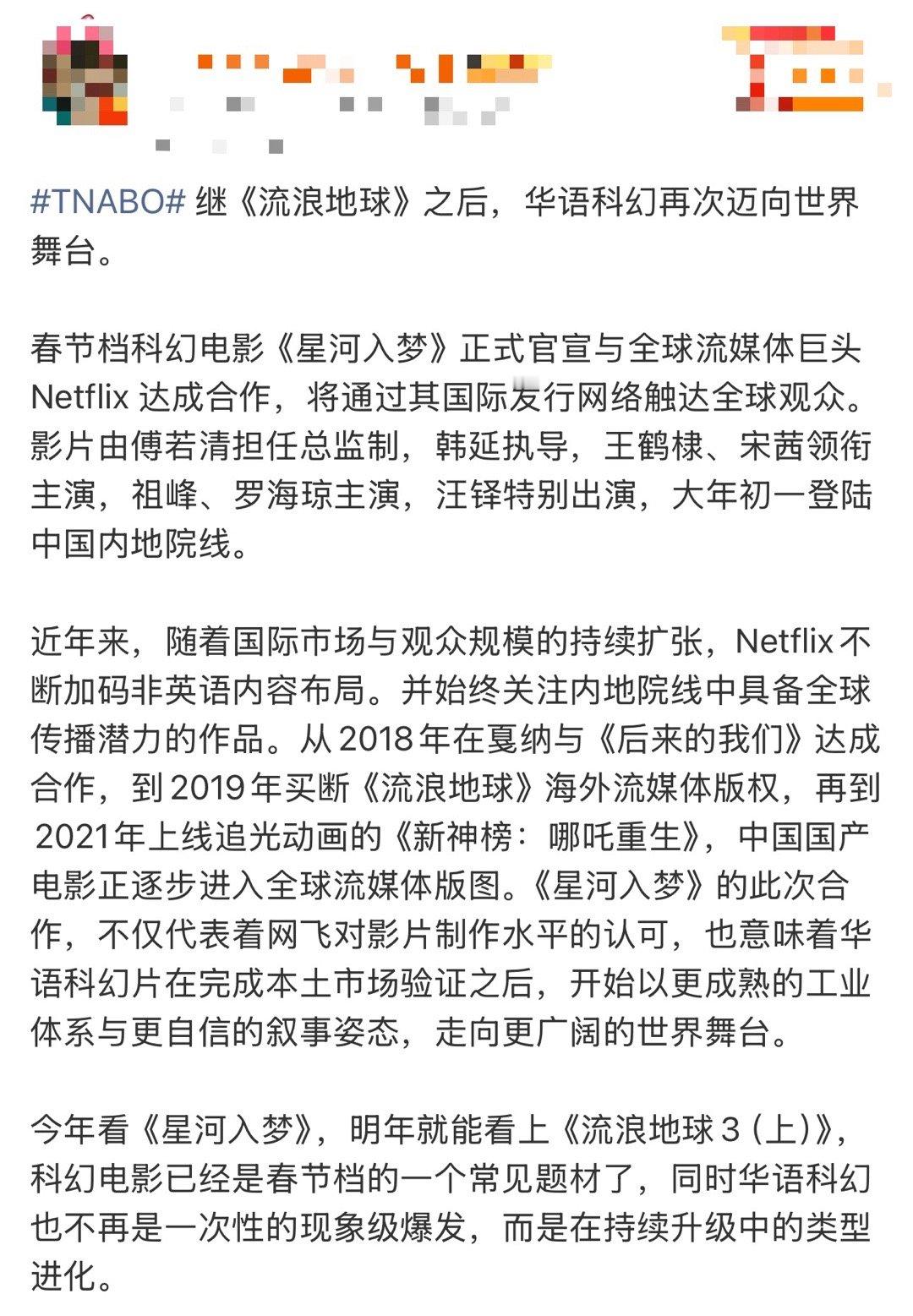 星河入梦映前就被奈飞买断什么概念天呐!被这个小星河的实力完全震惊!完全提气😍!星河入梦真是争气争气再争气,没上映Netflix直接就锁定映后的全球发行,完全就是我向全世界证明我看好你,看好星河入梦,看好中国科幻!从已经露出的几支预告里不难看出,娱乐属性很强的科幻片,科幻为娱乐服务,从侧面也力证中国科幻越来越丰富,越来越多元!期待星河入梦把中国科幻的路走宽!大年初一,必须去看!春节档马上有戏