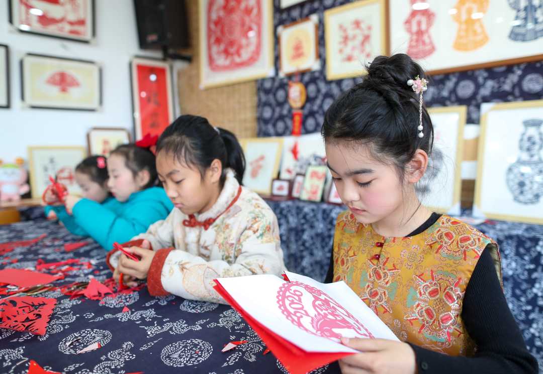 2月14日,江苏省兴化市垛田街道乡村非遗艺术馆,孩子们在创作以生肖“马”为主题的剪纸,感受传统年俗文化,喜迎新春佳节。