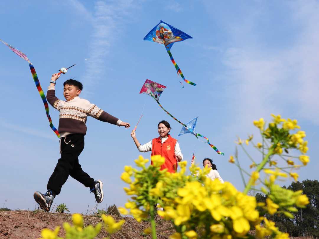 2月14日,四川省达州市大竹县石河镇新华村,小学生和党员志愿者在放风筝,快乐过寒假。