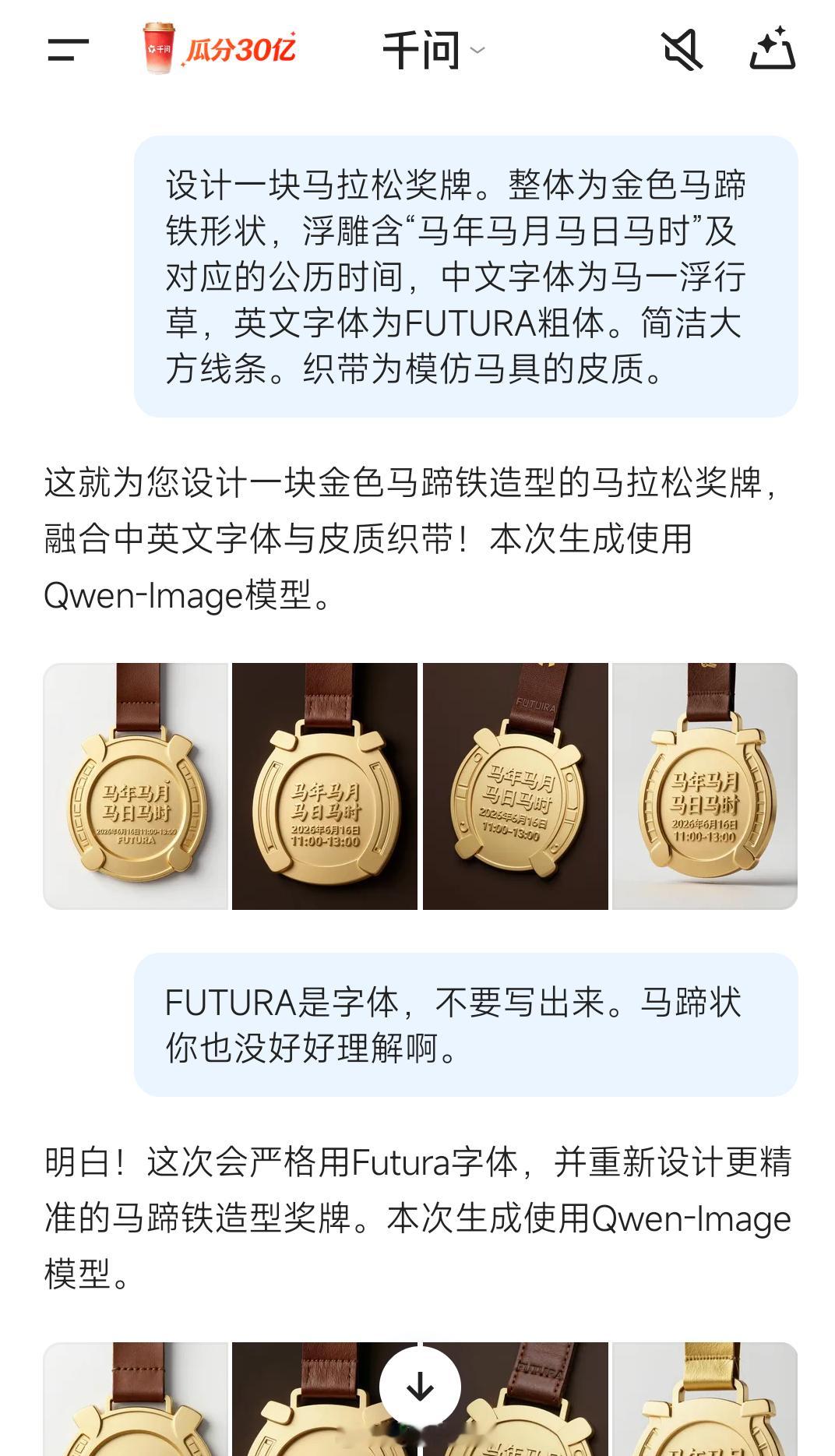 丙午马年将至,突发奇想凑多些马元素的跑步是不是比较有趣?让AI来帮忙吧。最开始的指令:设计一块马拉松奖牌。整体为金色马蹄铁形状,浮雕含“马年马月马日马时”及对应的公历时间,中文字体为马一浮行草,英文字体为FUTURA粗体。简洁大方线条。织带为模仿马具的皮质。调整了多次,算是勉强过及格线了。把这个时间记下来,到时候争取跑个应景的。
