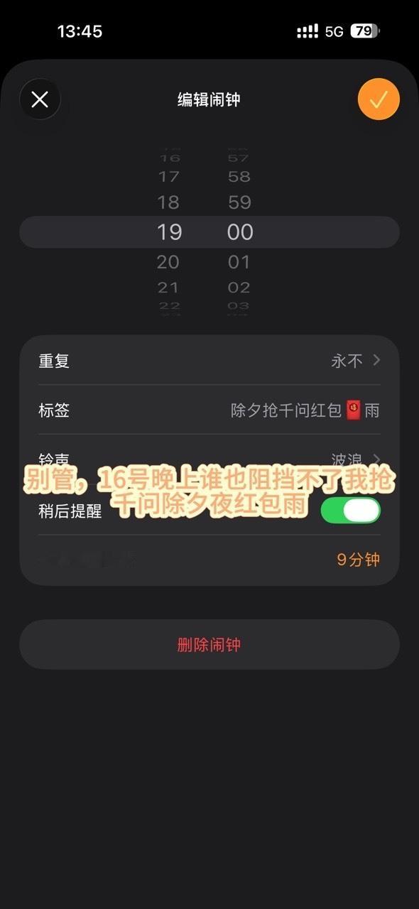 已经定好了千问红包雨的闹钟了我的眼神给出去了,千问新一波福利又来了,除夕夜整点红包雨,晚上七点开始,千问是赛博财神来的,已呼叫亲朋好友闹钟全部定起来