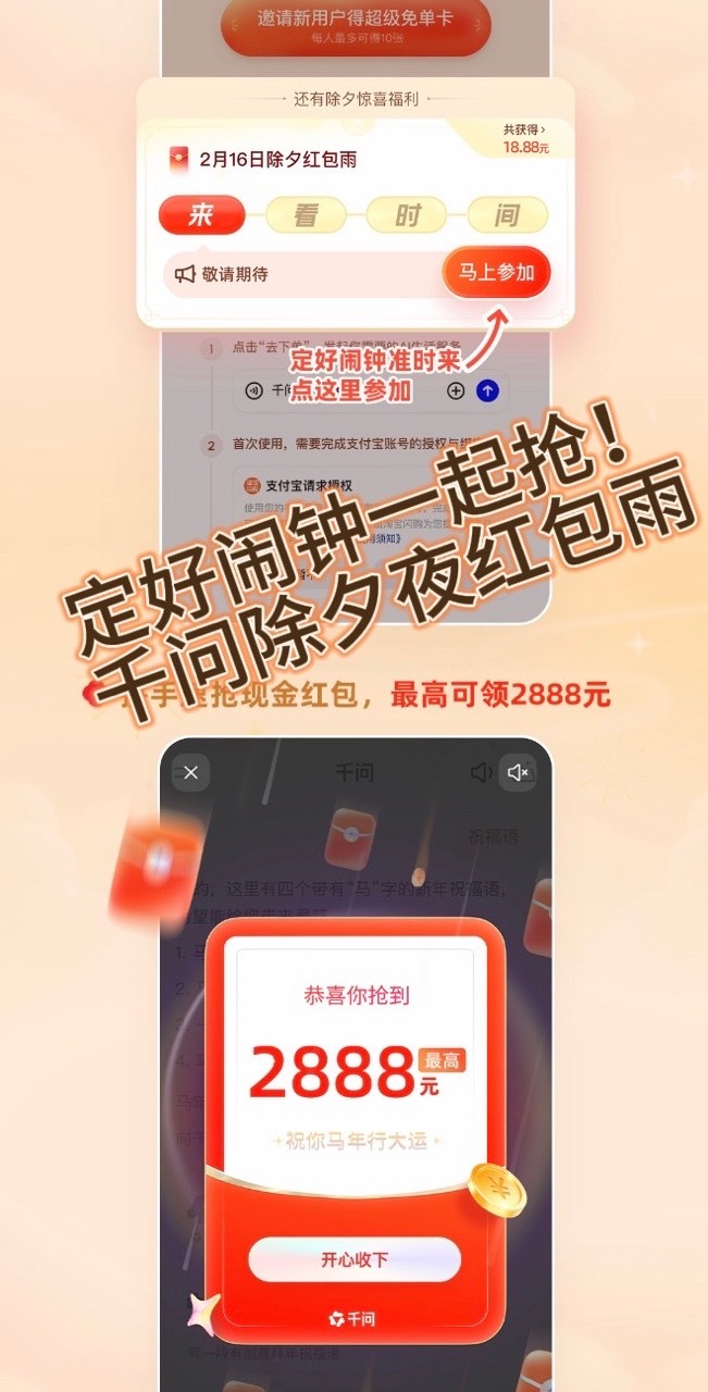 已经定好了千问红包雨的闹钟了我的眼神给出去了,千问新一波福利又来了,除夕夜整点红