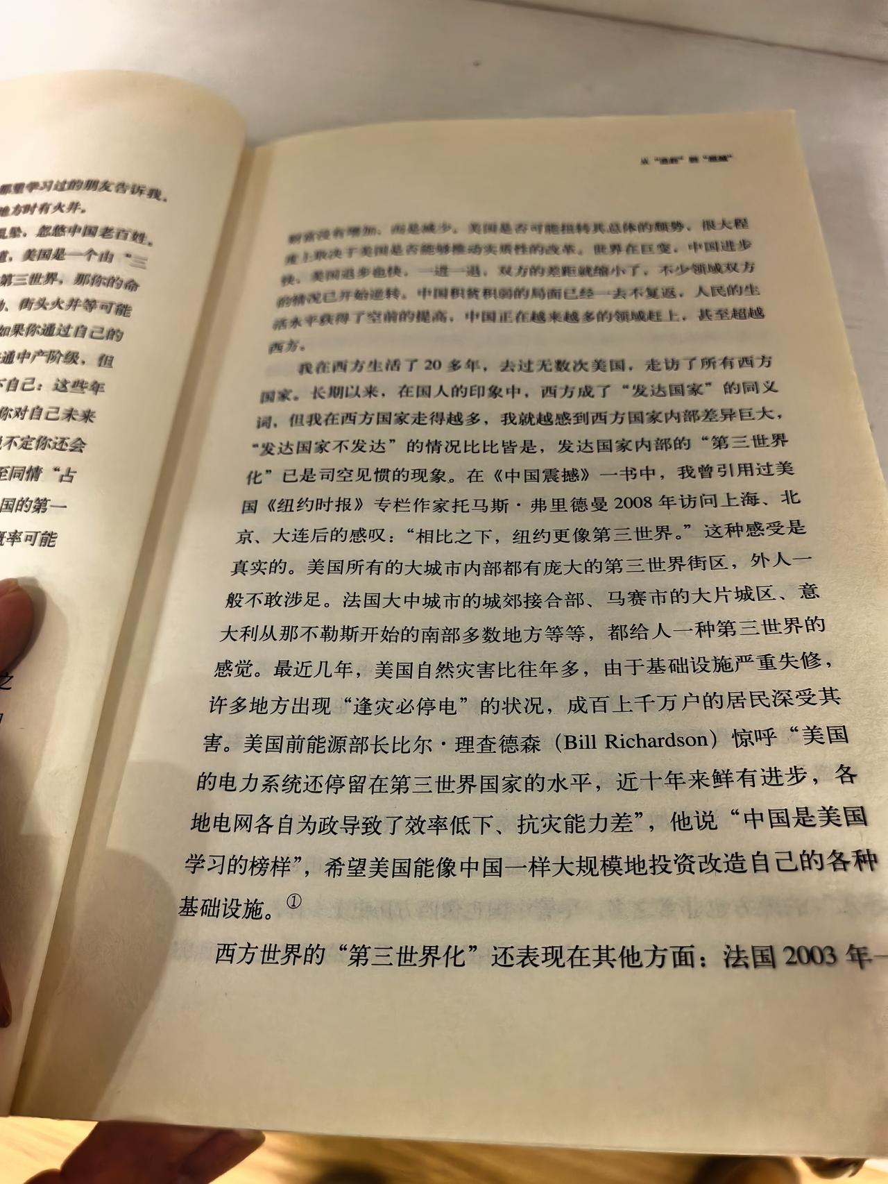 今天重读这本张维为的中国超越,深以为然。这是2014年这本书出版的时候很多人都认为美国是一种自吹自擂,书中也提到了美国的存在三个世界,美国和欧洲西方等很多城市存在第3世界。一个人的认知是逐步提升的。需要我们不断的去扩展自己的视野,不断的去实践,去学习,去读书。