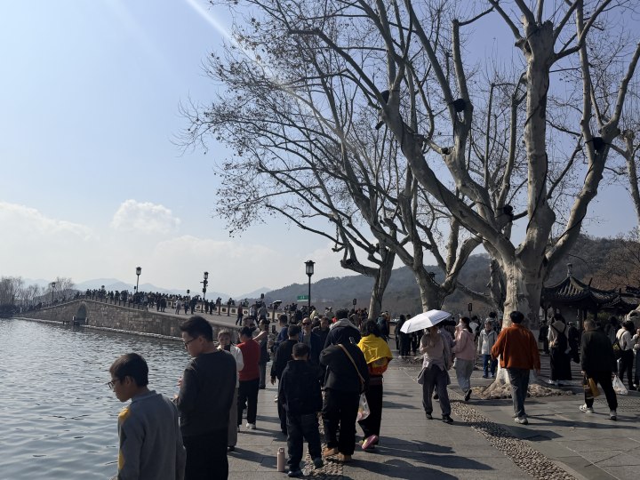 “再笑开一点!身子往湖边侧一侧,借点湖光才好看嘛!1、2、3——茄子!”身穿红色毛衣的艾阿姨举着手机,凑在屏幕前反复确认,又轻声喊胡奶奶调整姿势。78岁的胡奶奶扶着旁边的扶手慢慢转身,脸上的皱纹里都漾着笑,身后的西湖波光粼粼,风一吹,柳丝轻轻晃,不少游客脱了厚外套,穿件薄毛衣慢悠悠逛着,空气里都是晒着太阳的暖乎乎的味道,倒像是春游。