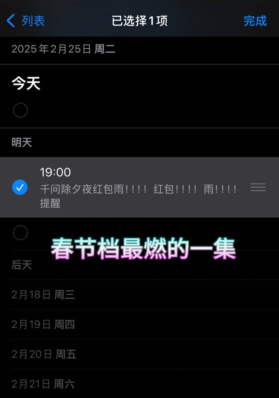 已经定好了千问红包雨的闹钟了千门集合,高雅人士速来品鉴,千问除夕红包雨,除夕当晚7点开始,欧气一定要眷顾我呀~~闹钟定起来提高中奖速度!