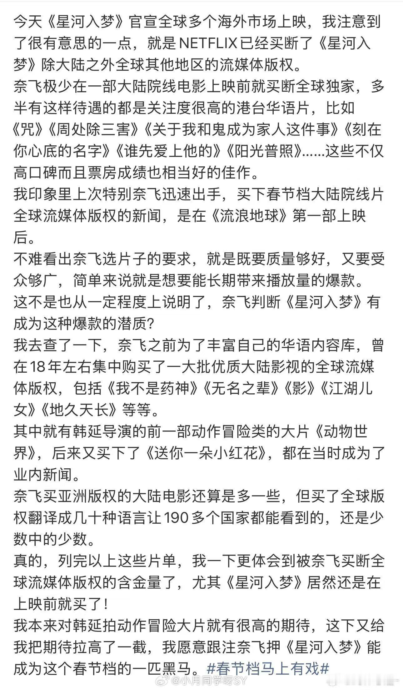海外流媒买断星河入梦的含金量星河入梦惊艳全球,网飞慧眼识珠,买断全球发行权。大年初一,看东方科幻如何征服世界,小成本铸就大梦想,争气再争气!
