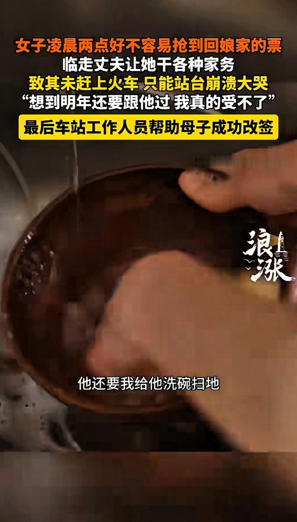 女子凌晨两点好不容易抢到回娘家的票,临走时丈夫让她干各种家务,致其未赶上火车,在站台上崩溃大哭。一想到明年还要跟他过日子表示真受不了。 湖南长沙这个远嫁女子太惨了。为了回娘家,凌晨2点半定闹钟抢票,抢到票时估计激动坏了。可出发那天,丈夫却各种使坏。 先是让她洗碗,接着又让拖地,摆明了是故意拖延。 她为了不吵架,忍气吞声都干了。结果赶到站台,火车就差5分钟开走。看着远去的火车,她崩溃痛哭。好在车站工作人员介入,帮她和孩子成功改签,这才得以回娘家。 这丈夫的做法真让人无语,回娘家这么重要的事还捣乱。好不容易抢到回娘家的车票,作为丈夫这样做真是很过分。 女性嫁人真是要看清楚男人,这种男人真是想把给妻子气死,嫁给狗也比这样的男生人强。 也提醒大家,出行前一定得提前规划好时间,别让类似的遗憾发生。