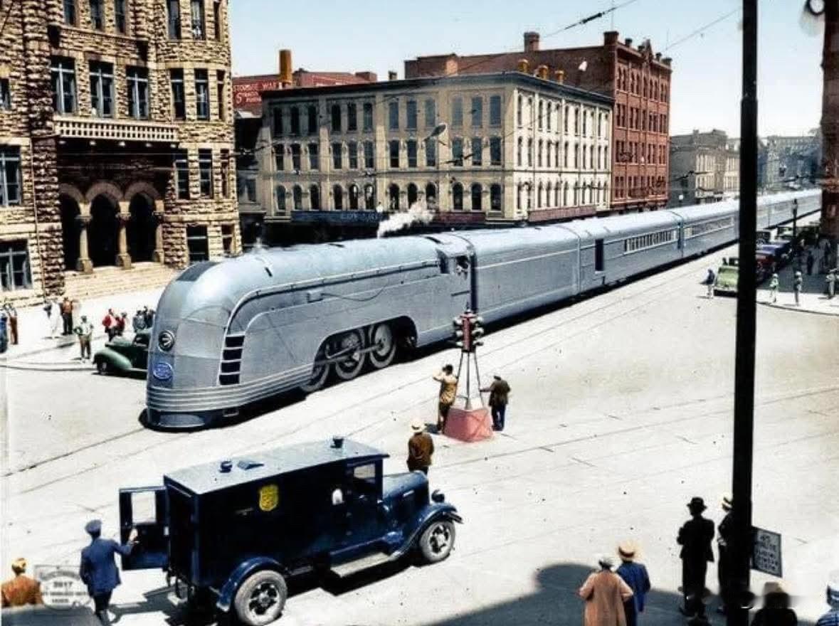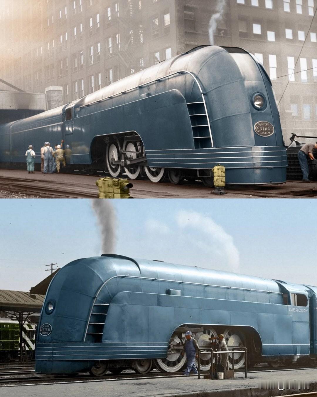 世界上最美的火车——1936年芝加哥车站的“水星”号…… “水星号”(Mercury)是纽约中央铁路公司为其运营于中西部城市之间的一系列日间流线型客运列车所起的名称。这些“水星号”列车由著名工业设计师亨利·德雷福斯设计,被认为是流线型现代主义设计的典范之作。“水星号”的成功使德雷福斯获得了1938年纽约中央铁路公司旗舰列车“20世纪特快”(20th Century Limited)重新设计的委托,该列车是美国最著名的列车之一。 第一辆水星号列车于1936年7月15日投入运营,每日往返于克利夫兰和底特律之间。随后,芝加哥水星号列车(往返于芝加哥和底特律之间)和辛辛那提水星号列车(往返于辛辛那提和底特律之间)也相继开通。水星号列车一直运营到20世纪50年代,最后一辆幸存的列车——最初的克利夫兰水星号列车——于1959年7月11日完成了它的最后一次运行。 20世纪30年代中期,纽约中央铁路公司启动了一项旨在提升其在中西部地区客运量的实验。目标是打造一种全新的、以速度和创新为核心的流线型服务。“墨丘利”(Mercury)是罗马信使之神的名字,因其寓意速度而被选中;该名称于1936年5月14日正式公布。这列新列车被誉为“明日列车”。