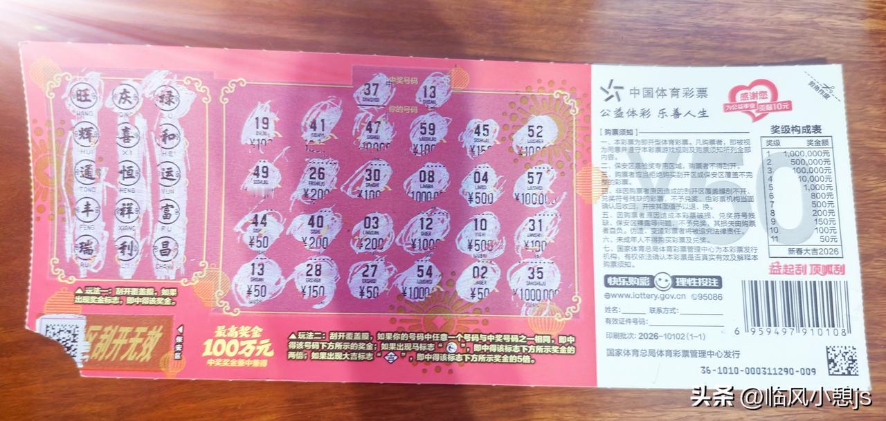 今天中午吃饭路过体彩店,家人非说我手气好,让我买一张。 我到柜前问老板娘有没有2元体彩?她告诉我说没2元的,只有面值10元、20元、30元、50元的。 去这家买体彩的先后有三个人,最早到的是位年轻小伙,他买了好几张20元的,正在卖力的一张一张刮卡,最后刮了个寂寞;第二个就是我,不多买,只买了一张50元的,中了赚,不中就当乐呵;第三个是位男士,买了四沓20元的,一沓30张,他说买回去给老婆孩子们玩玩。 我在老板娘的指点下,用刮卡器上下左右开搂,嘿,你猜怎么着,还真中了50元!这运气也是没谁了。 今天买彩五十块,一开就中五十块, 幸运数字一十三,正好艾伦身上穿, 十三一现好运来,缘分到了躲不开, 艾伦带我把奖开,红红火火发大财!