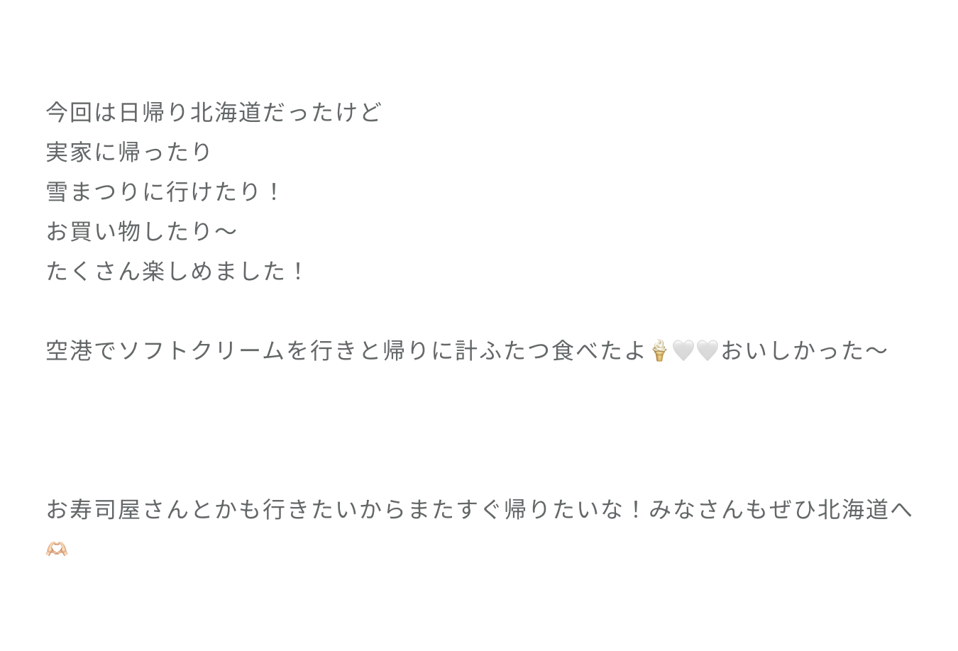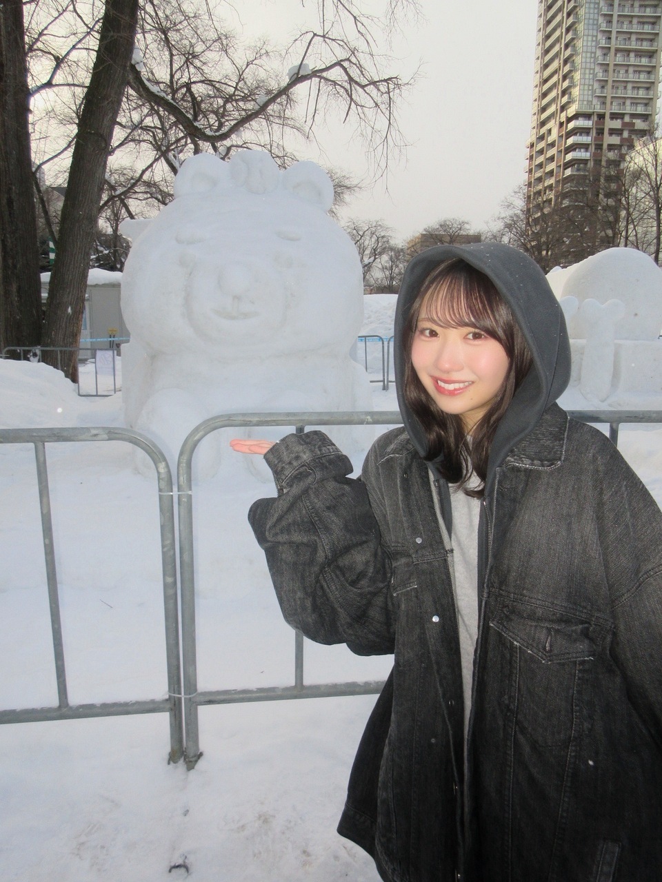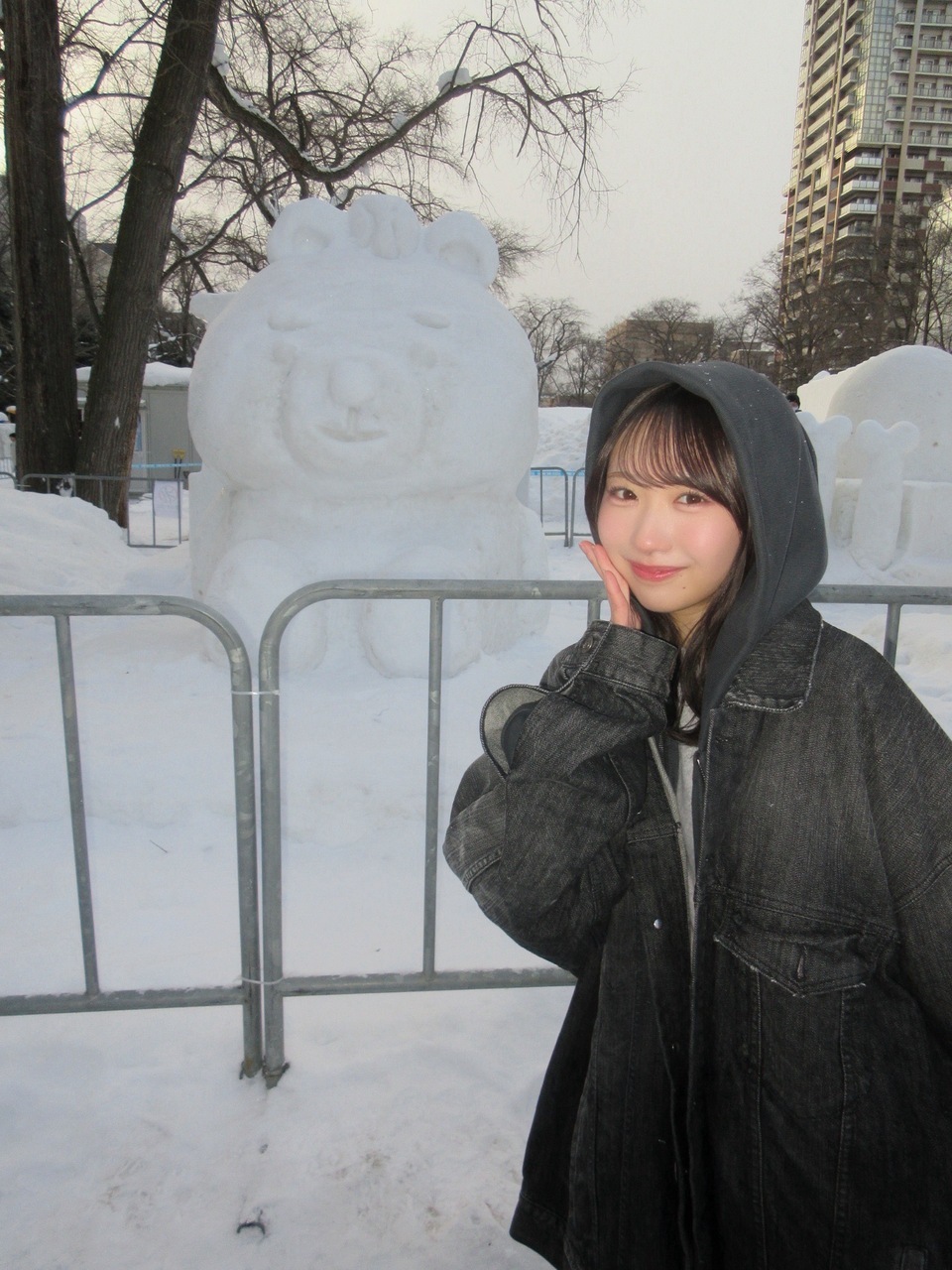 藤嶌果歩「先日北海道に日帰り旅してきたのでそちらをお見せしようかなと〜〜さっぽろ雪まつりに行ってきたよ!ずーっと行きたかった場所だったのですごく嬉しかったです!ちっちゃい時から小学生くらいまで毎年楽しみに行ってたんですけど、中学生頃には部活やらテストやらで段々行けないまま上京しちゃったのでずっと恋しかったんだ!念願の雪まつりたのしかったーー⛄️」