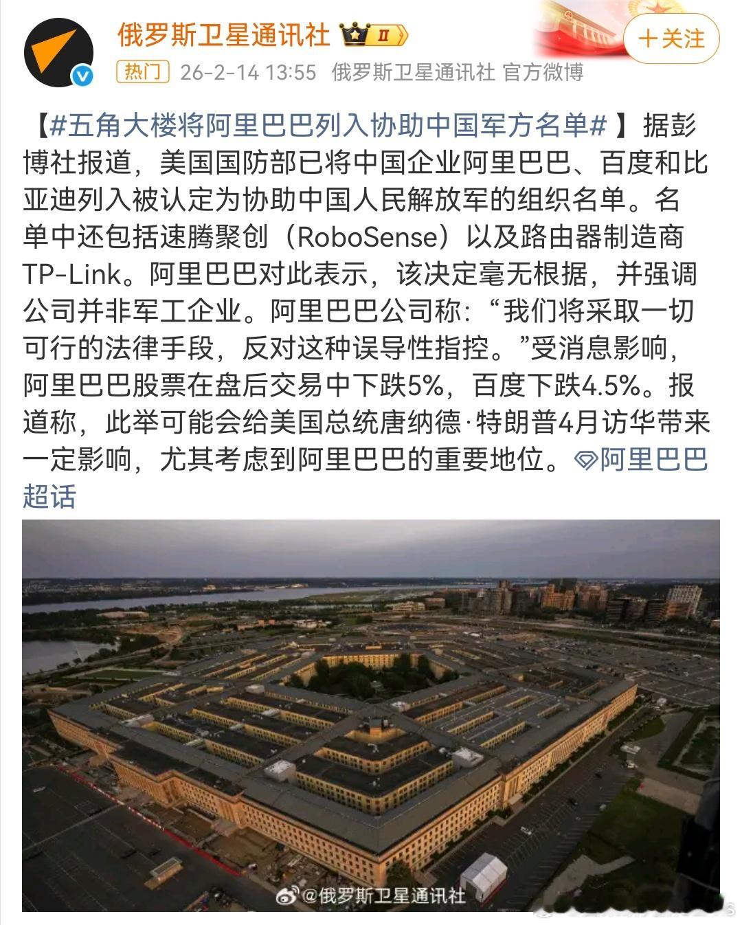 五角大楼将阿里巴巴列入协助中国军方名单怎么比亚迪也在啊?不是技术都是特斯拉开源吗?你快去跟特朗普说比亚迪技术都是美国自己不用的“没有技术”,快去啊,造谣中国新能源汽车技术都是特斯拉开源的时候不是挺能叭叭吗?快去五角大楼说明情况,不去看不起你。