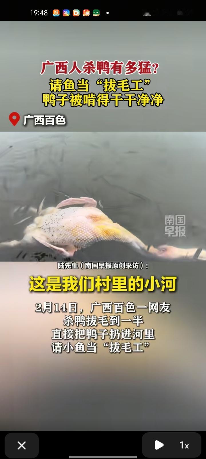 2月14日,广西百色。男子杀鸭拔毛到一半,直接把鸭子扔进河里,请小鱼当“拔毛工”