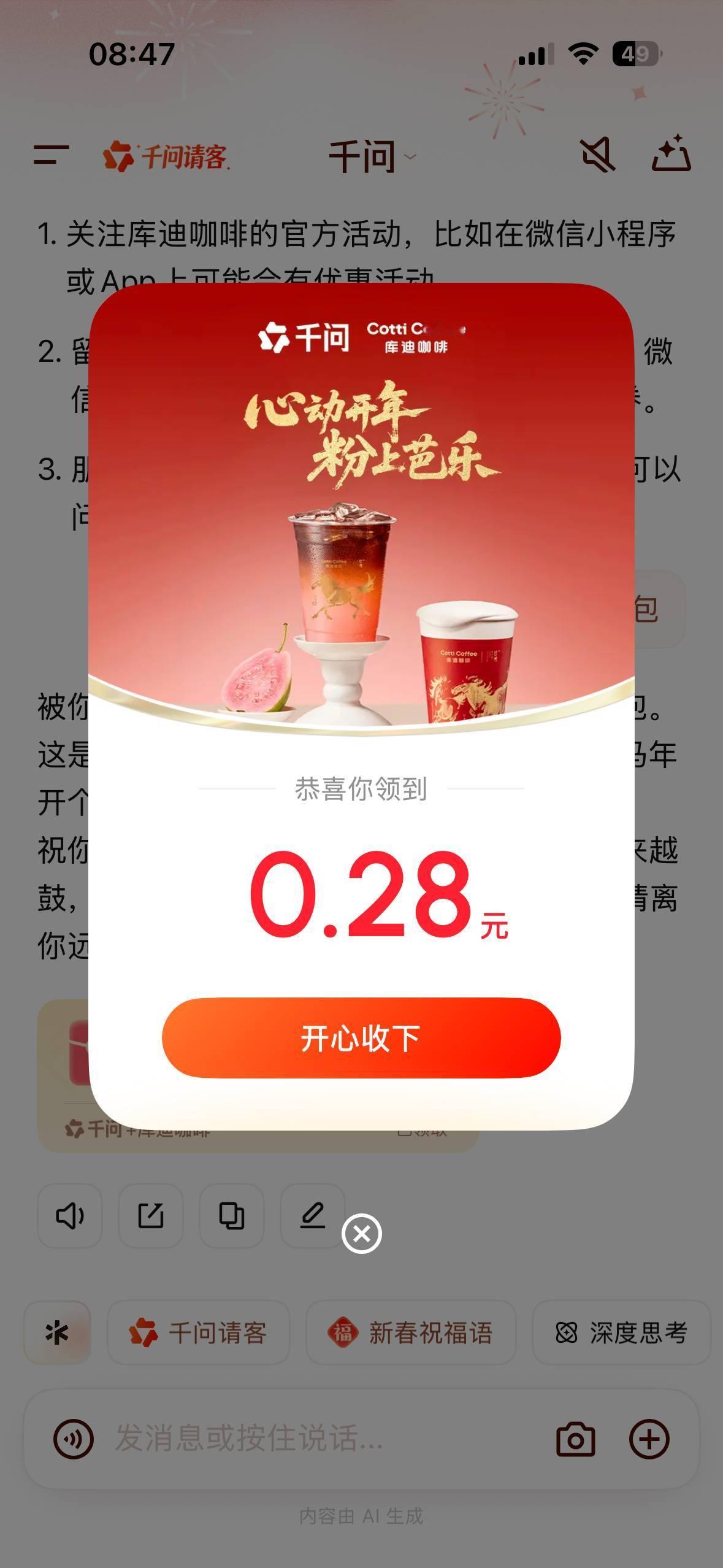 一不留神,我out了?怎么都在晒千问口令红包封面 不甘落后的我也要捞一捞!就是想了半天不知道红包口令是啥,蒜鸟蒜鸟,点杯奶茶补补脑力!突然灵光一闪,千问?奶茶?这不对上了嘛!果断输入几款常喝的奶茶牌子,直接连中好几个红包哈哈哈哈,这下,我也成晒红包大军一员了千问除夕夜红包雨最高2888元