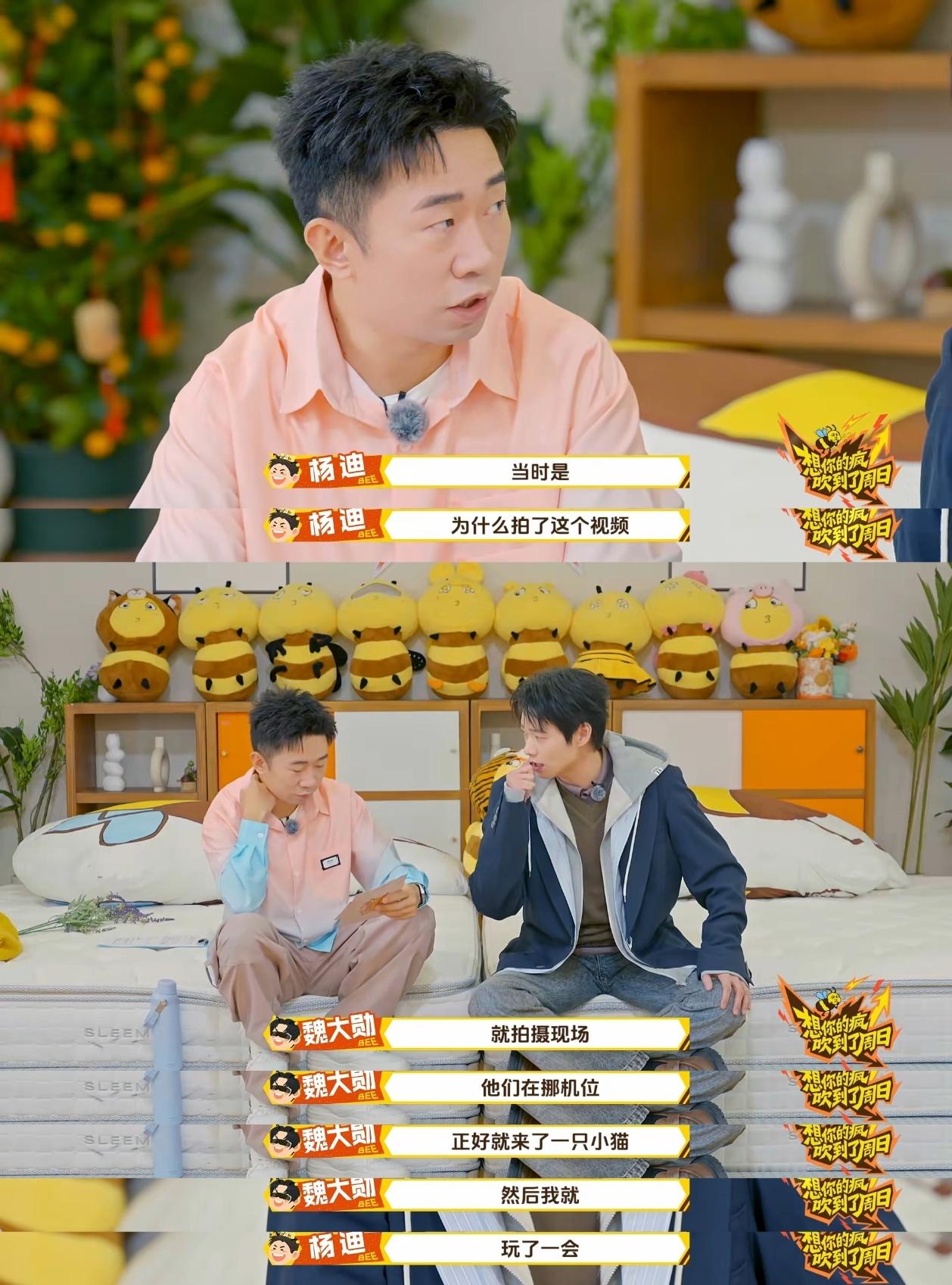 魏大勋还原摸猫神图名场面 魏大勋现场还原西装革履逗小猫神图,看到玩具猫眼神一秒温柔,说平时就喜欢小动物,会被路上的小猫吸引逗它们玩,这样一个反差感满分的大勋花,谁能不爱呢~周五晚高疯