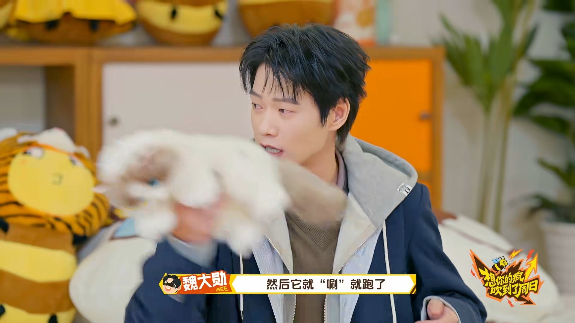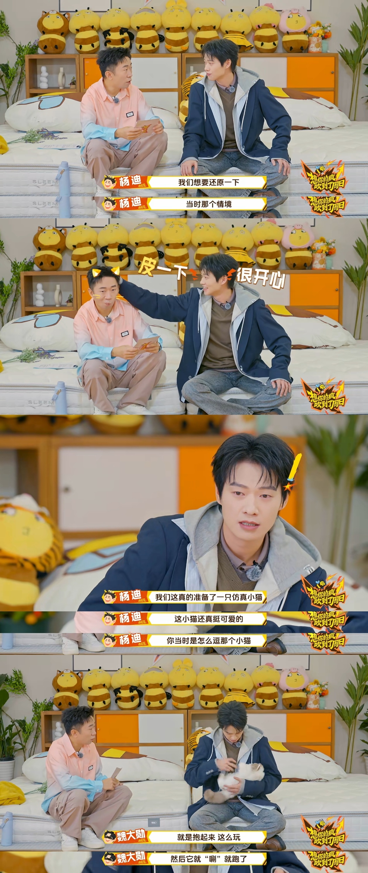 魏大勋还原摸猫神图名场面 魏大勋现场还原西装革履逗小猫神图,看到玩具猫眼神一秒温