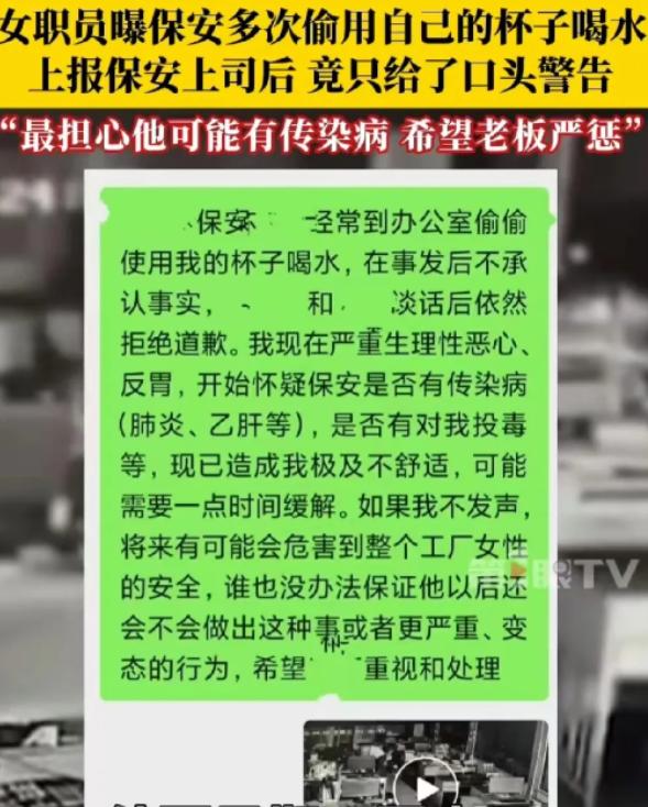 保温杯被保安天天偷喝, 公司说“只是小事”, 谁来管这杯水的底线? 那天我看到陆姐在茶水间发呆,杯子空了,人也蔫了。 她说保安连续两周趁她去开会,拿她保温杯喝水,茶叶少了,水有怪味,晚上睡不着,一想到就反胃。 监控拍到好几次,他专挑没人时溜进去,拿稳了才喝,不是顺手摸错。 公司最后就口头说了两句,连个书面记录都没有。 陆姐想查幽门螺杆菌,公司没安排检测,也没道歉,反而劝她“别闹大”。 这哪是喝水?是天天动别人贴身的东西,像翻你抽屉、穿你衣服一样让人发毛。 保安能随便进办公区,说明门禁和权限早乱了,真出事谁负责? 制度写在纸上不执行,等于没写。 员工放个杯子都提心吊胆,还谈什么信任? 公司后来补了句“会加强管理”,但陆姐已经提了离职。 水凉了,杯子还摆在桌上。