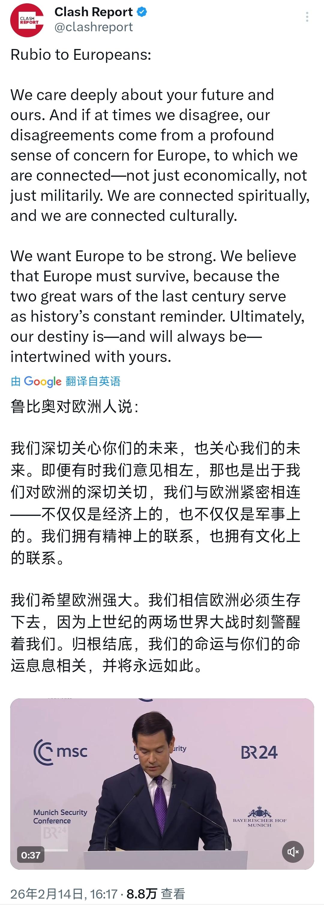 特朗普政府对欧洲的态度改变了? 美国国务卿鲁比奥2月14日在慕尼黑安全会议上对欧洲喊话:“我们深切关心你们的未来,也关心我们的未来。即便有时我们意见相左,那也是出于我们对欧洲的深切关切,我们与欧洲紧密相连不仅仅是经济上的,也不仅仅是军事上的。我们拥有精神上的联系,也拥有文化上的联系。我们希望欧洲强大。我们相信欧洲必须生存下去,因为上世纪的两场世界大战时刻警醒着我们。归根结底,我们的命运与你们的命运息息相关,并将永远如此。” 熟悉国际局势的人都记得,2017年到2021年特朗普第一次担任美国总统期间,对欧洲的态度可以说是毫不客气。 2026年,特朗普重新入主白宫,一开始对欧洲的态度依旧强硬,没有丝毫缓和的迹象。2026年1月17日,特朗普直接对外宣布,从2月1日开始,对德国、法国、英国、瑞典等欧洲8个国家出口到美国的所有商品加征10%的关税,并且放话,到6月1日,关税税率还要提高到25%。给出的理由依旧是欧洲在贸易上占美国便宜,美国要拿回属于自己的利益。 这一决定直接惹怒了欧洲各国,8国领导人迅速发表联合声明,公开指责美国的行为破坏了跨大西洋安全架构,欧盟也拿出了专门应对经济霸凌的反胁迫工具,准备对美国进行反制。那时候的美国,还是一副说一不二、强硬到底的样子,丝毫没有要和欧洲缓和关系的意思。 可谁也没想到,短短一个月的时间,美国对欧洲的态度就来了个一百八十度大转弯。2026年2月14日,鲁比奥在慕尼黑安全会议上的讲话,彻底换了一副口吻,没有了以往的指责、施压和威胁,全程都在强调美欧的亲密关系,反复提及美欧同根同源,有着共同的文化和精神根基,还说美国不想看到西方世界衰落,愿意和欧洲携手实现复兴。这种前后反差极大的表现,根本不是美国突然良心发现,而是美国的自身处境和国际局势,逼得它不得不放低姿态,改变对欧洲的策略。 美国态度转变的第一个核心原因,是自身陷入了难以解决的困境,急需欧洲帮忙撑场面。现在的美国,国内面临着严重的滞胀问题,通胀水平一直居高不下,经济增长动力严重不足。之前美国执意和中国打贸易战,本想通过加关税打压中国发展,结果搬起石头砸了自己的脚,对中国商品加征关税,直接导致美国国内企业的原材料、机器设备成本大幅上涨,工厂生产成本飙升,最终这些成本全都转嫁到了美国老百姓身上,生活压力越来越大。 在国际上,美国想单独依靠自己的力量遏制中国、压制俄罗斯,已经越来越力不从心,霸权地位不断下滑。这种情况下,美国再也不能像以前那样对欧洲颐指气使,必须拉上欧洲这个重要的盟友,才能勉强维持自己的全球霸权,要是再继续强硬施压,欧洲真的会彻底翻脸,美国就会失去最关键的帮手。 第二个原因,是欧洲各国越来越清醒,不想再一直做美国的附庸。这几年,欧洲各国明显意识到,一直依附美国只会丧失自身的话语权,所以一直在全力推进战略自主。德国和法国牵头,不断加快欧洲自身防务体系的建设,想要摆脱对美国的军事依赖,不再把自己的安全完全交到美国手里。 贸易上,欧洲各国也不再唯美国马首是瞻,2026年1月以来,英国、芬兰、爱尔兰等多个欧洲国家的领导人接连访华,主动寻求和中国的经贸合作,希望通过多元化的贸易合作,减少对美国市场的依赖。美国清楚地看到,再用以前的强硬手段对待欧洲,只会把欧洲彻底推向对立面,所以只能收起强硬的嘴脸,改用温情话术拉拢欧洲,稳住这个越来越不听话的盟友。 鲁比奥说希望欧洲强大,根本不是希望欧洲实现真正的自主强大,而是希望欧洲能多掏钱提升防务能力,帮美国分担军事压力,让美国能腾出更多精力对付其他国家。他说美欧命运息息相关,本质上是想把欧洲牢牢绑在美国的战车上,让欧洲跟着美国的全球战略走,一起对抗新兴大国,为美国的霸权利益冲锋陷阵。 他拿上世纪的世界大战警醒欧洲,不过是想让欧洲忘记自身的实际利益,彻底服从美国的指挥,不敢有半点二心。美国自始至终,都没有真正关心过欧洲的未来,它关心的只有自己的霸权能不能延续,自己的利益能不能得到最大保障。 可欧洲人心里清楚,美国的温情只是暂时的,一旦欧洲出现不听话的苗头,或者美国解决了国内的经济问题、稳住了国际局势,马上就会变回那个咄咄逼人的样子,重新加征关税、逼迫欧洲提高军费,之前的强硬手段会一样不少地再次用到欧洲身上。 在这个利益至上的国际舞台上,没有永远的朋友,只有永远的利益。欧洲要想真正掌握自己的命运,就必须坚持独立自主,不被美国的表面温情迷惑。而我们中国,始终坚持相互尊重、公平正义、合作共赢的国际关系理念,不搞霸权霸凌,不忽悠任何国家,不把任何国家当成自己的附庸,这才是各国和平共处、共同发展的正确道路,也会得到越来越多国家的认可和支持。