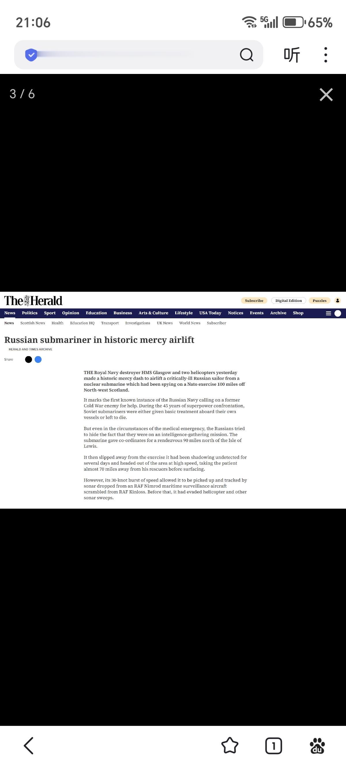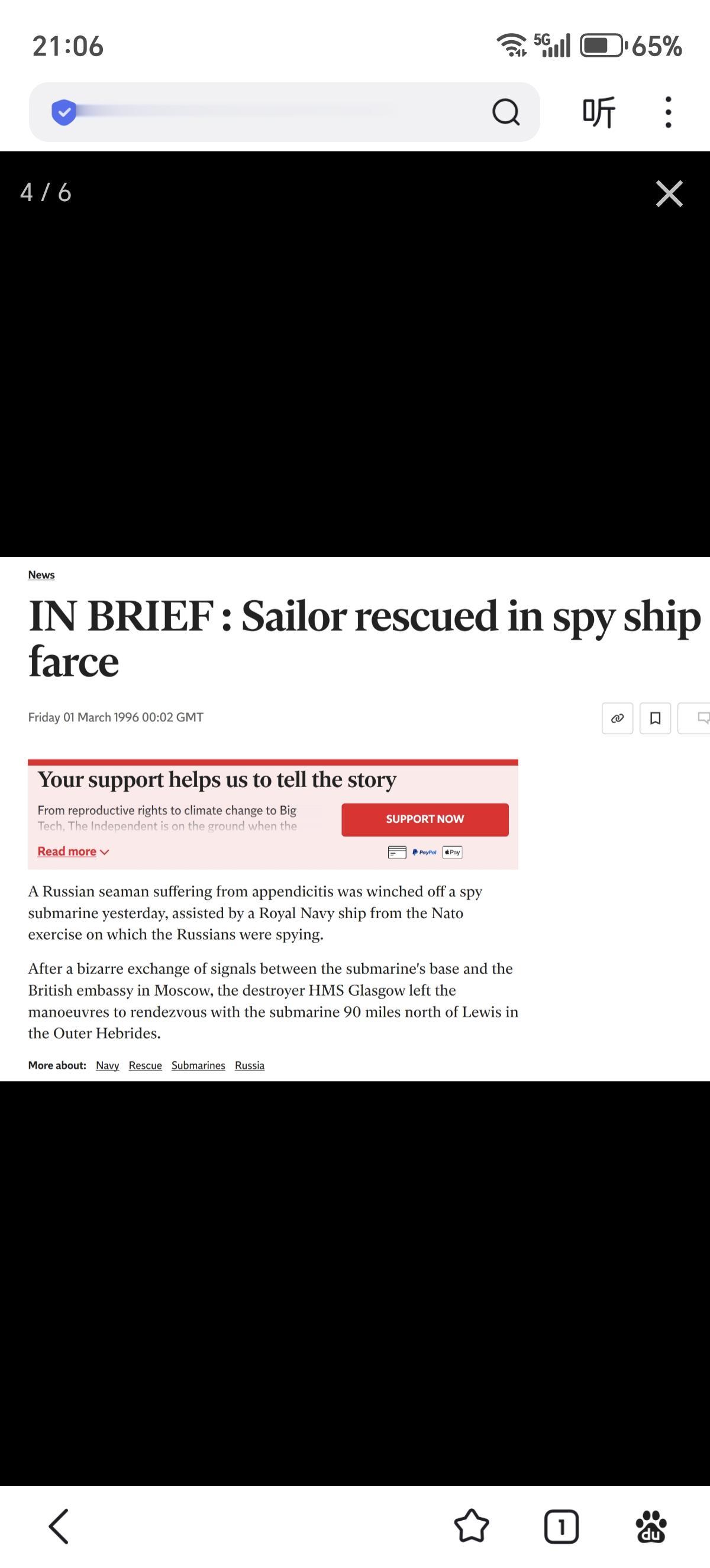 1996年2月29日,位于苏格兰西北约100英里外的北大西洋,正在进行的北约JMC军演舰艇编队中央浮起了一艘潜艇,被英国水兵识别为971型攻击核潜艇。该潜艇上一名艇员因阑尾炎术后引发腹膜炎,急需紧急医疗救治。这名水兵随后被转移至英国皇家海军42型驱逐舰“格拉斯哥”号(图1),随后由“山猫”直升机转运至医院。 而实际上,这艘潜艇是671RTMK型K-448“坦波夫”号(图2)。英国媒体报道此事时,《泰晤士报》指出这展现了改进型“维克托III”级攻击核潜艇的出色静音性——整支北约舰队在其上浮前完全未探测到该潜艇。且在潜艇上浮后,英国皇家海军将其错误认定为更先进的“阿库拉”级。 交叉印证:北约视角见图3(英国《泰晤士报》档案)、图4(英国《独立报》档案)和图5(美国UPI通讯社档案),俄方视角见图6(《军事验收》纪录片)。