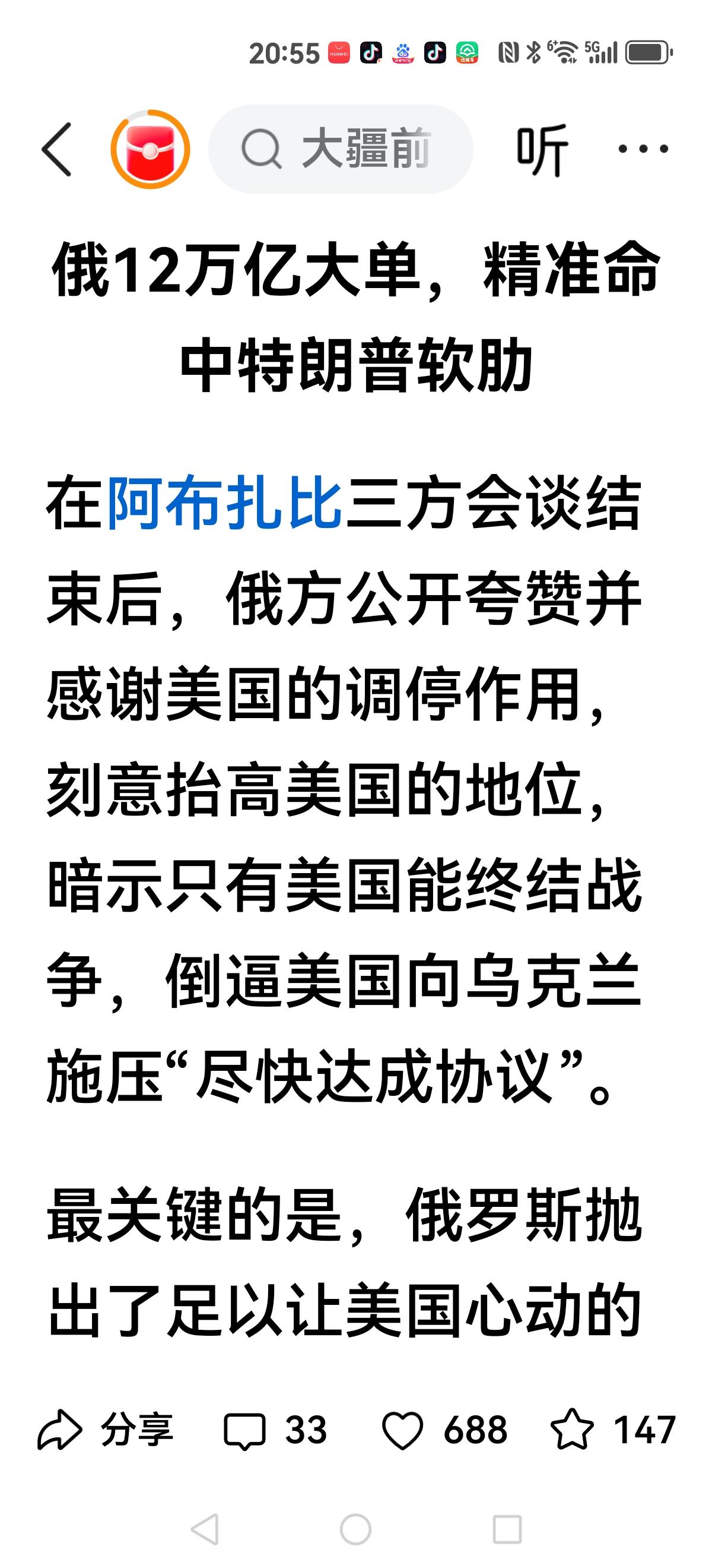 【特朗普孤注一掷】 给俄乌战争划出最后的红线今年六月。 特朗普美国优先,那么一味支援乌克兰,显然违背这个原则,国内压力增大,另外上台前承诺俄乌战争必须停火等等多方面考虑。 先给乌克兰施压,迫使泽连斯基答应赴约,另一方面给普京最后的通牒。 普京其实远比泽连斯基难受,一方面乌克兰无人机频频袭击俄罗斯本土。另一方面进攻迟迟不见成效,国内压力也是与日俱增。 因而普京为了得到更多体面,用稀土贿赂特朗普,提出12万亿经济大单。 看来美国不仅仅是世界警察,还是调停高手。这一点国内张,金,沈,高不得不服吧?
