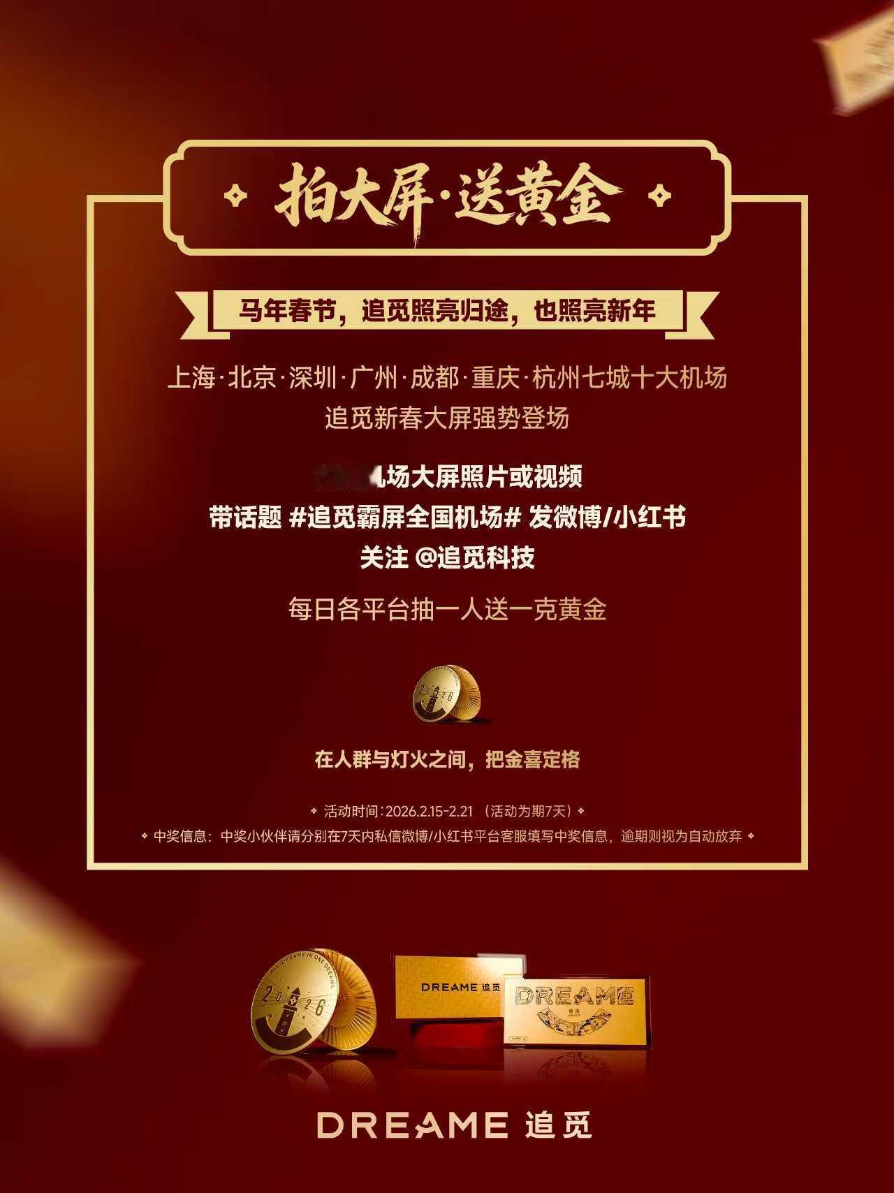 近日,追觅科技“全员黄金福利”刷屏社交平台。作为2026年央视春晚智能科技生态战略合作伙伴,追觅在为全体员工送上新春福利后,又将这份诚意传递给全国用户——2月15日起,追觅正式启动“上春晚 送黄金”活动,线上线下多渠道联动,邀全民共沾新春财气,彰显国民级高端智能生态品牌的雄厚实力。此前,追觅科技为全体员工每人发放一克定制黄金作为年终奖加码,引发全网热议,追觅用实际行动诠释“员工比黄金更珍贵”的理念。如今,追觅更将这份诚意回馈广大用户,以黄金致谢支持,同步呼应春晚舞台上的高端亮相,让新春福气与智能科技走进更多家庭。本次黄金赠送活动覆盖线上线下全场景,多种方式均可参与抽奖。首先,线上渠道购买春晚同款产品,线下参与全国门店打卡活动或购买春晚同款,均有机会抽取一克黄金。另外,追觅已覆盖《马上春晚》《下一站春晚》及春晚等整个央视春晚矩阵,截图追觅春晚相关画面带话题发帖,即可参与抽奖。同时在春晚期间,追觅线下曝光持续发力。追觅在上海、北京、深圳、广州等七座城市十大机场大屏重磅登陆,矩阵式占领春节出行流量高地。旅客拍摄机场大屏画面带话题发帖,也有机会获取黄金,可谓福气与排面双丰收!从央视春晚国家级舞台的惊艳亮相,到全国核心机场大屏的全域霸屏,再到全民可参与的黄金互动,追觅此次春节的全面曝光,构建了一套“高端背书+场景渗透+情感链接”的立体化矩阵。这绝非简单的流量刷屏,而是品牌实力与品牌温度的深度释放——既以硬核科技立足市场,更以暖心福利回馈员工和大众。让这个春节,既有科技的温度,也有黄金的分量。梦想新年值得追觅追觅全场景生态亮相春晚