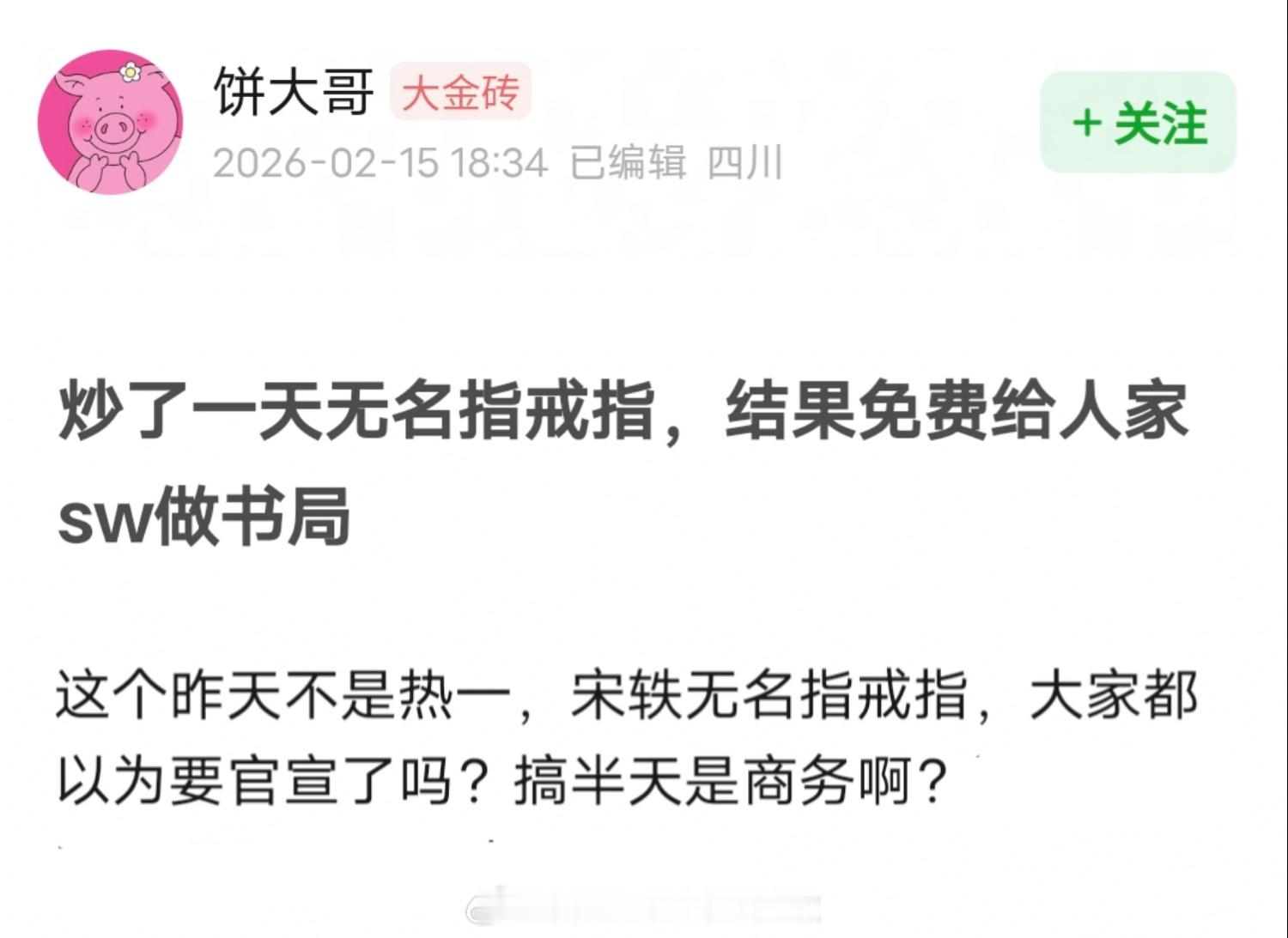 情人节刷屏了一整天的宋轶无名指戴戒指,网友都在猜测是不是跟恋情有关?复合了或者准