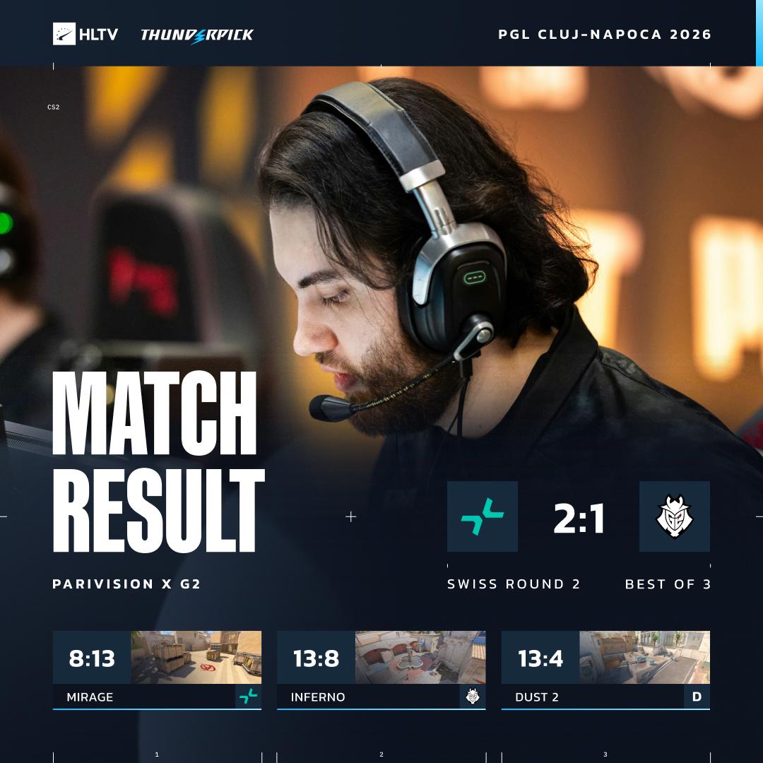 虎扑02月15日讯PGL克卢日-纳波卡站瑞士制小组赛第二轮0-1组:PARIVISION对阵G2