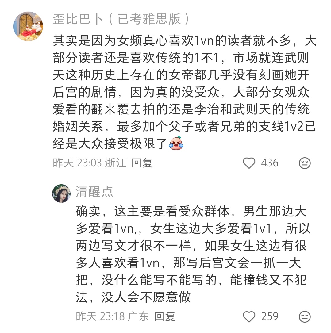 是的,这个确实是因为女频里面1v1的读者受众更多,甚至快穿都必须是同一个人切片换装