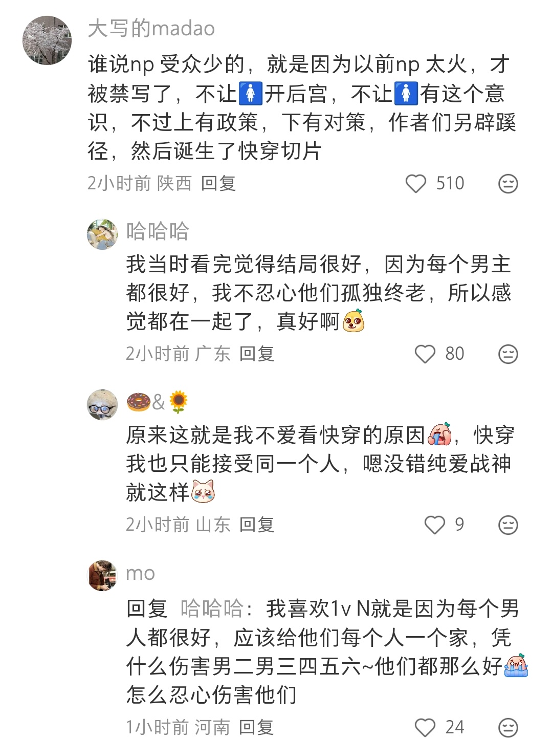 是的,这个确实是因为女频里面1v1的读者受众更多,甚至快穿都必须是同一个人切片换