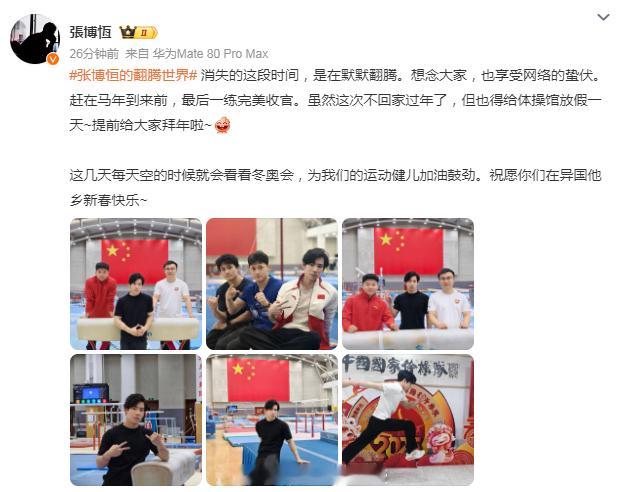 张博恒祝冬奥健儿新春快乐 张博恒更新社媒:消失的这段时间,是在默默翻腾。想念大家,也享受网络的蛰伏。赶在马年到来前,最后一练完美收官。虽然这次不回家过年了,但也得给体操馆放假一天~提前给大家拜年啦~