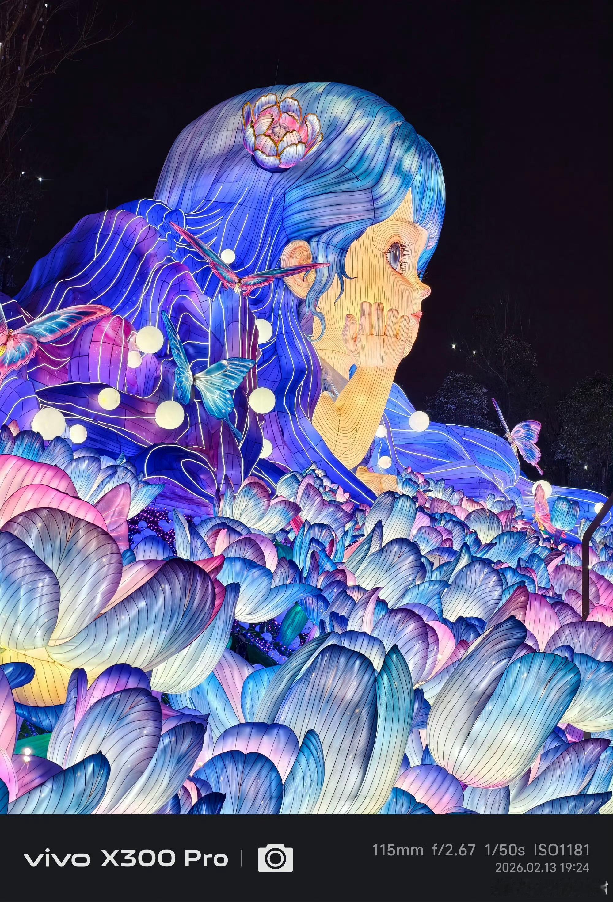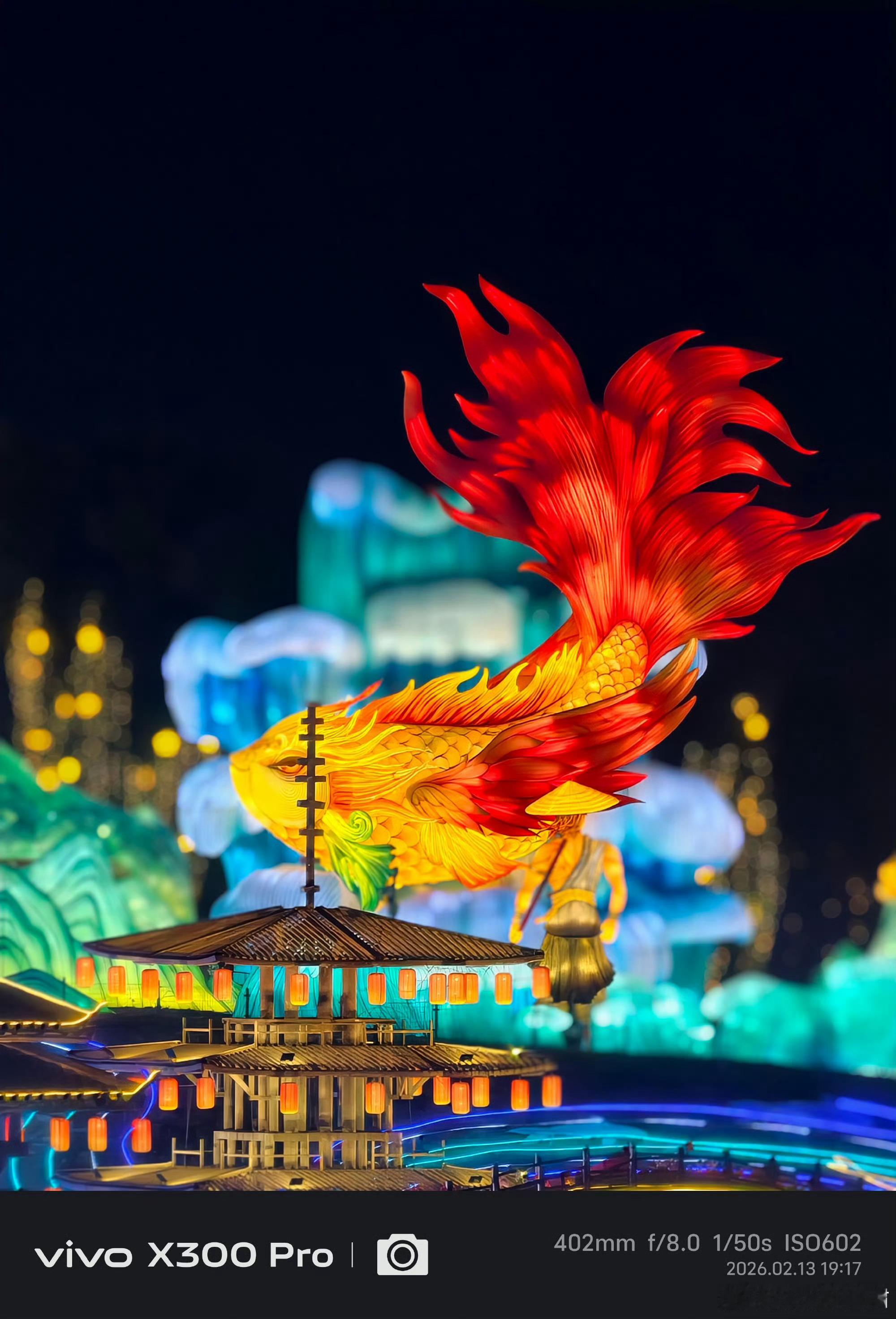 背景的青蓝色山峦灯组与前景的暖色调形成鲜明对比,营造出富有层次的视觉冲击力,这得益于其强大的色彩管理能力。在细节与控噪方面,即使在402mm长焦、f/8.0光圈、1/50s快门的参数下,锦鲤的鳞片纹理、亭台的木质结构依然清晰可见,同时ISO 602的设置也有效控制了噪点,保证了画面纯净度,展现了其在长焦夜景下的硬实力。在动态范围上,它精准捕捉了灯组的高光与暗部细节,没有出现过曝或死黑,让整个场景的氛围感得以完整保留。