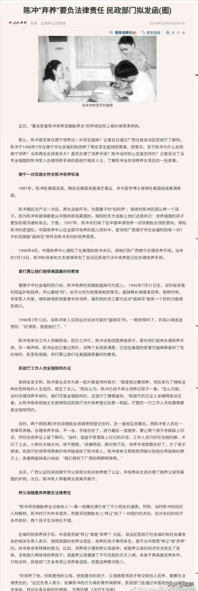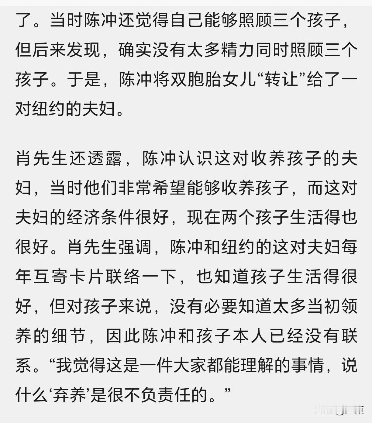 孩子去哪了?不出意外,陈冲又要被推上风口浪尖。随着美国萝莉岛事件不断发酵,很多人重新翻出一桩陈年旧账:当年陈冲领养的那对广西双胞胎姐妹,到底去哪了? 当年,陈冲从广西南宁福利院领养了一对双胞胎女婴,对外表现得十分有爱。可就在她生下亲生女儿之后,这对双胞胎就凭空消失了。 她始终没有正面回应,没有解释,没有交代。 她的经纪人曾解释为“转让给了别人”,但按照我国领养相关法律,被领养的孩子视同亲生子女,任何人无权私自转送、弃养,更不能在没有正规手续的情况下,把孩子交给他人抚养。 这么多年过去,陈冲在荧幕前风光依旧,晒着亲女儿的幸福生活,却对那对曾经被她领养的双胞胎绝口不提。 没有道歉,没有说明,连孩子如今身在何处、过得好不好,公众一无所知。 作为公众人物,享受着光环与流量,却对两条小生命如此轻贱。 大家要的其实很简单: 陈冲,请给公众一个交代——那对广西双胞胎姐妹,到底去哪了?