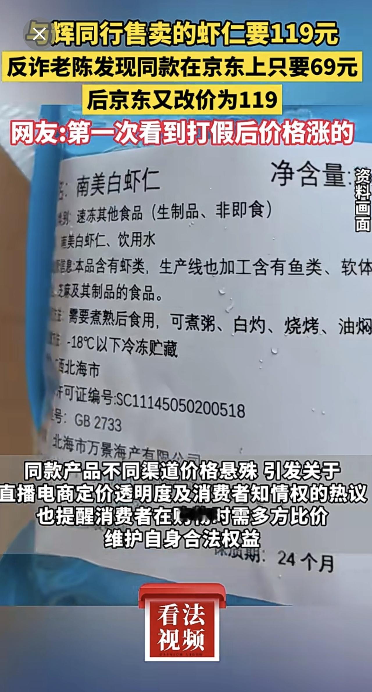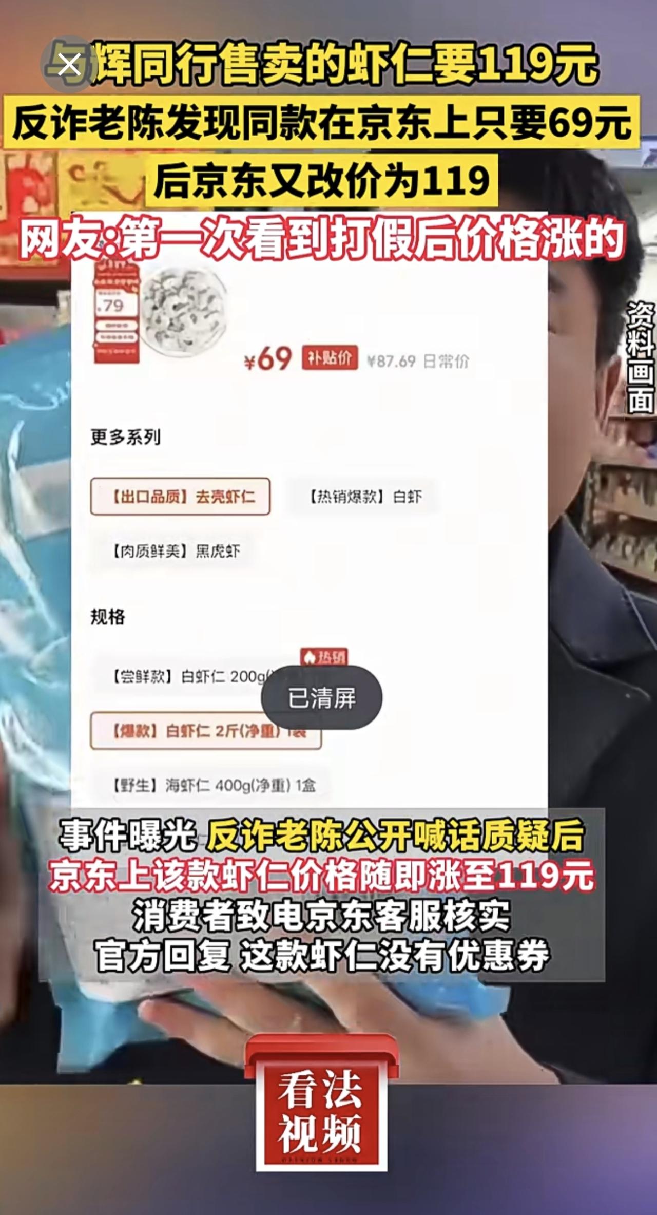 与辉同行售卖的虾仁要119元,反诈老陈发现同款在京东上只要69元,后京东又改价为119!网友:第一次看到打假后价格涨的 与辉同行 反诈老陈