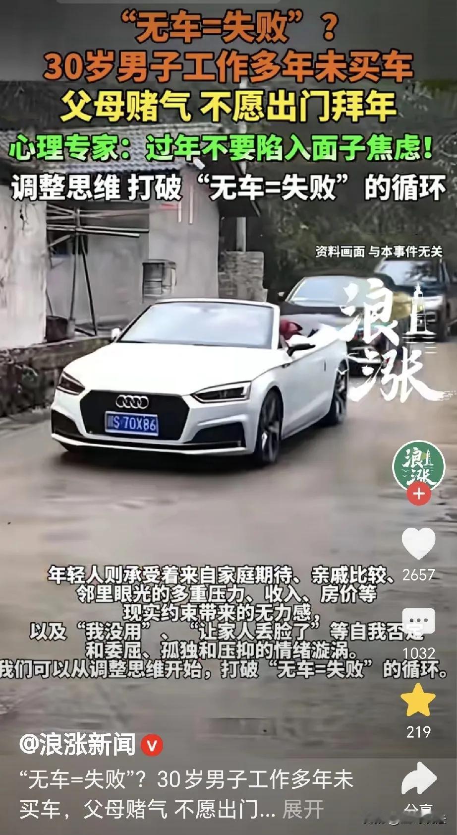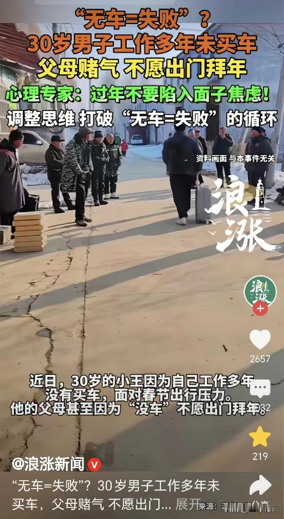 没车就等于失败吗?没车在亲戚面前就抬不起头吗?一位30岁的男子工作多年,一直没钱买车,回老家之后父母生闷气,感觉孩子没啥出息,也不肯出门拜年,天天就窝在家里,哪里都不肯去。父母表示:“还有啥脸出去拜年呢?车都没有!”男子也很郁闷,难道说,没车就等于很失败吗?没车就代表混的不好吗? 2月13日,闪电新闻的镜头捕捉到了一个令人唏嘘的画面,但这并非个案,而是无数返乡游子心头的一根刺。 镜头里,30岁的王先生站在村口,寒风吹得他衣角翻飞。他并非衣锦还乡的所谓“成功人士”,而是一个靠双腿走回来的普通打工人。 请注意他父母的表情。那一刻,老两口站在村头,脖子伸得老长,眼神里燃烧着一种近乎烫人的期待。但当儿子的身影清晰地出现在视野中,身后没有扬起汽车的烟尘,也没有发动机的轰鸣,那两张饱经风霜的脸上,笑容出现了物理性的凝固。 这不是简单的失望,而是一场家庭“压力测试”的开始。在父母的剧本里,30岁的儿子、多年的工龄、城市的积蓄,这些要素加在一起,必须导向一个唯一的物理结果:一辆车。 现实是残酷的。王先生两条腿走回来的画面,瞬间击碎了二老在村口积攒了一年的底气。 回到家,空气里的火药味几乎不需要点燃。这不是一场关于交通工具的讨论,而是一场关于“资产定义”的激烈博弈。 在王先生看来,他的账本算得清清楚楚:手里的积蓄是用来应对生活暴击的“防风林”,是必须死死守住的现金流。车子落地即贬值,在这个充满不确定性的年代,把钱变成一堆损耗品,除了增加脆弱性,毫无意义。 但在父母的逻辑体系里,这本账完全是另一套算法。在乡村这个熟人社会的斗兽场里,车子压根就不是拿来开的,它是挂在腰间的“身份令牌”,是过年走亲访友时的“面子护照”。 王先生试图解释什么是生活成本,什么是风险控制,但在父母听来,这全是没本事的借口。邻居们聚在一起随口的一句闲聊,传到老两口耳朵里,经过内心那套敏感的解码系统,全变成了刺耳的嘲讽。 冲突在拜年这个节点迎来了总爆发。这本该是春节最重要的社交仪式,却因为一辆缺席的车,演变成了一场荒诞的“卧室罢工”。 父母直接躲进了房间,拒绝起床,拒绝洗漱,更拒绝踏出家门半步。那个画面实在太具冲击力:两个加起来一百多岁的老人,像受了委屈的孩子一样生闷气。 当王先生提出骑电动车去亲戚家时,父亲爆发了。那句怒吼几乎震碎了父子间最后的体面:“骑电动车去?你是想让亲戚们笑死我吗?我不去丢这个人!” 听听这句话。在父亲的认知里,电动车这一交通工具,直接等同于“耻辱柱”。为了规避这种想象中的社交羞耻,他们选择了最极端的防御手段:切断社交。 整个春节,一家人就这么僵持着。屋外的鞭炮声越响,屋内的死寂就越刺耳。这真的仅仅是因为一辆车吗?显然不是。这是两代人价值观的剧烈冲撞,是一场关于“成功”定义权的争夺战。 对于现在的年轻人来说,能在高房价、高物价和不稳定的就业环境中活下来,保持现金流不断裂,已经是莫大的胜利。那种无力感和负罪感,像潮水一样淹没了王先生。他觉得自己没用,不仅没能给父母挣来面子,反而让他们在村里抬不起头。 这时候,我们或许需要引入一点冷峻的法理视角。翻开《民法典》,法律对子女的义务规定得很清楚:赡养、扶助、保护。但请注意,法律条文里没有任何一行字写着:子女必须购买机动车以满足父母的虚荣心。 将物质消费强行绑定在孝道标准上,这本身就是一种伦理绑架。父母想要的面子,本质上是一种对他人的恐惧,恐惧被比较,恐惧被看低。但如果一段亲情关系,需要靠消耗子女的安全感来维持表面的光鲜,那这段关系本身就已经不仅是失衡,而是病态了。 那个躲在房间里生闷气的父亲,其实比谁都可怜。他被困在了别人的眼光里,为了所谓的“排面”,亲手把团圆饭变成了夹生饭。 没车就等于失败吗?这本该是个伪命题。但在那个具体的时空里,只要父母心里的那个坎过不去,这就成了王先生无法逃避的真命题。 春节过完了,王先生终究是要离开村子的。但那场关于“面子”与“里子”的战争,恐怕在很长一段时间里,都不会有赢家。