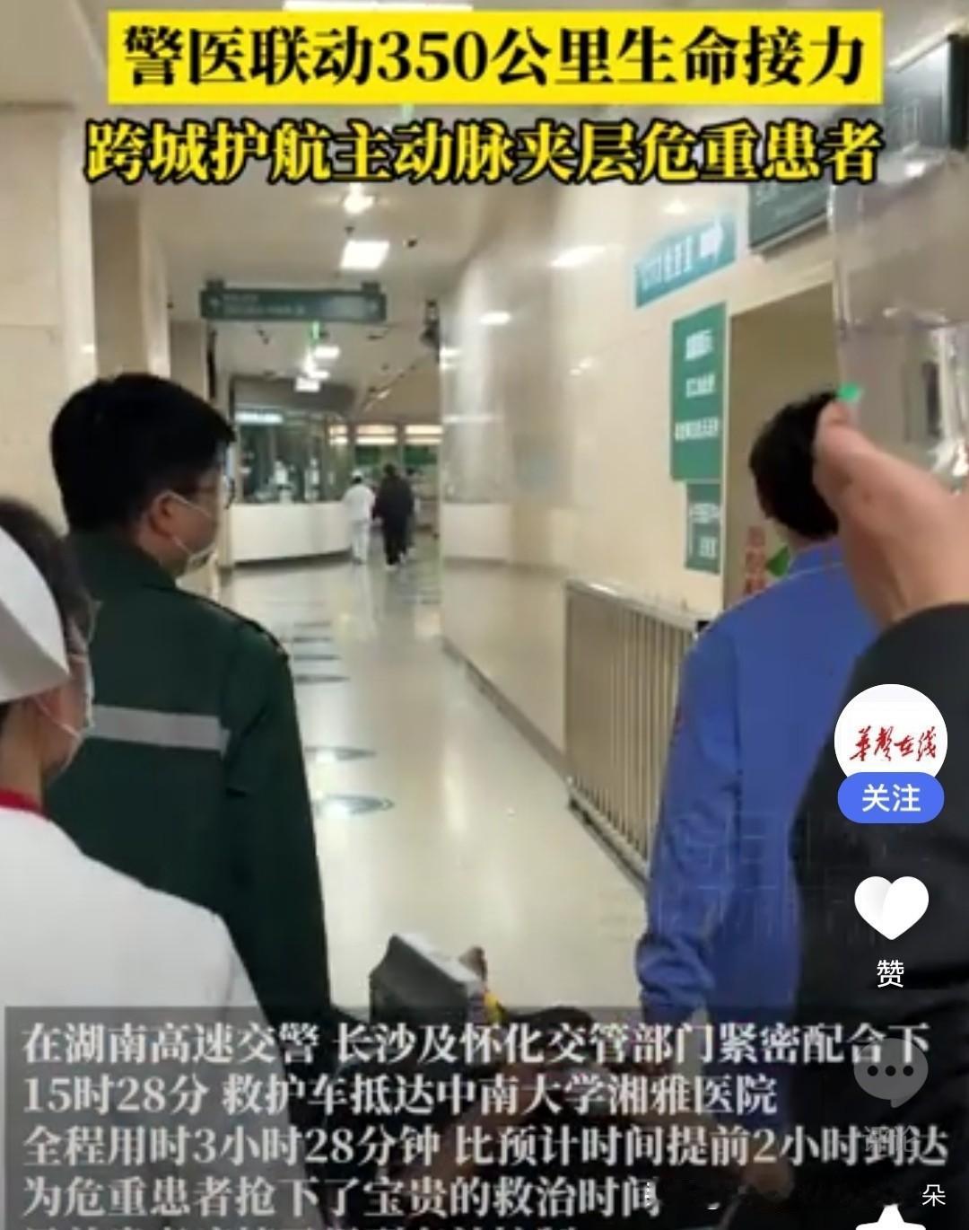 【生命速递!湖南警医联动上演"生死时速",350公里3小时28分创生命奇迹】 2月14日,一场与死神赛跑的"生命护航"在湖南高速上展开——一名从怀化转往长沙的主动脉夹层危重患者,在省公安厅交管总队指挥情报中心启动的警医联动机制下,由湖南高速交警、长沙及怀化交警全程接力护航,仅用3小时28分钟便完成350公里转运,比预计时间提前2小时抵达中南大学湘雅医院,为抢救生命抢出黄金窗口! "主动脉夹层"有多凶险?每一秒都是倒计时! 主动脉夹层被称为"血管里的定时炸弹",一旦破裂死亡率极高,患者需立即接受手术。此次转运的患者病情危急,从怀化到长沙的常规车程需5小时以上,而患者的身体根本等不起! 接到求助后,湖南省公安厅交管总队指挥情报中心第一时间启动警医联动应急预案:精准规划最优路线、协调沿途交警接力管控、实时同步路况与患者状态……一场跨地域的生命护航就此拉开帷幕。 警灯闪烁!全警联动织就"绿色生命通道" 清晨,怀化交警率先行动,驾驶警车开道引导救护车驶入高速;湖南高速交警接力,通过监控实时调整信号灯、疏导车流,确保沿途无拥堵;长沙交警提前在收费站、医院周边布控,清空应急车道……从怀化南到长沙岳麓大道,350公里的路程被划分为多个"护航段",每段都有交警定点值守、动态巡逻。 "当时高速上车流量不小,但看到警灯闪烁,所有车辆都主动避让,就像给我们让出了一条'生命跑道'。"参与护航的高速交警回忆道。途中,指挥中心还通过视频连线实时掌握患者生命体征,随时调整车速与路线,确保转运万无一失。 3小时28分!比预计提前2小时抵达,医生直呼"太及时了!" 上午,救护车顺利抵达湘雅医院急诊楼。此时距离出发仅过去3小时28分钟,比原计划缩短近2小时!早已等候在门口的心外科团队立即接手患者,迅速推进术前准备。 "主动脉夹层手术越早做成功率越高,这提前的2小时,可能就是生与死的区别!"接诊医生表示,警医联动的高效配合为患者赢得了宝贵的救治时间。目前,患者已转入ICU接受进一步治疗,生命体征平稳。 网友点赞:这就是"中国速度",更是"生命温度"! 事件经媒体报道后,迅速引发全网关注。网友纷纷留言:"警灯为生命开道,这就是最暖的守护!""湖南交警好样的,向所有参与者致敬!""科技+协作,让不可能变成可能!" 这场"生死时速"的背后,是湖南公安"人民至上、生命至上"的责任担当,也是警医联动机制常态化建设的成果体现。近年来,湖南持续深化"警医联动",通过信息共享、快速响应、协同处置,已成功护航数百名危重患者,用"速度与温情"书写着守护生命的答卷。 生命至上,使命必达! 为湖南交警、医护人员点赞,愿患者早日康复!🙏💖 (来源:湖南省公安厅交管总队 ) 湖南警医联动 生命速递 生死时速 温暖守护 【小编说】 每一次紧急护航,都是对"人民公安为人民"的最好诠释。愿这份"速度与温情"能传递给更多人——因为有你们,人间更值得!