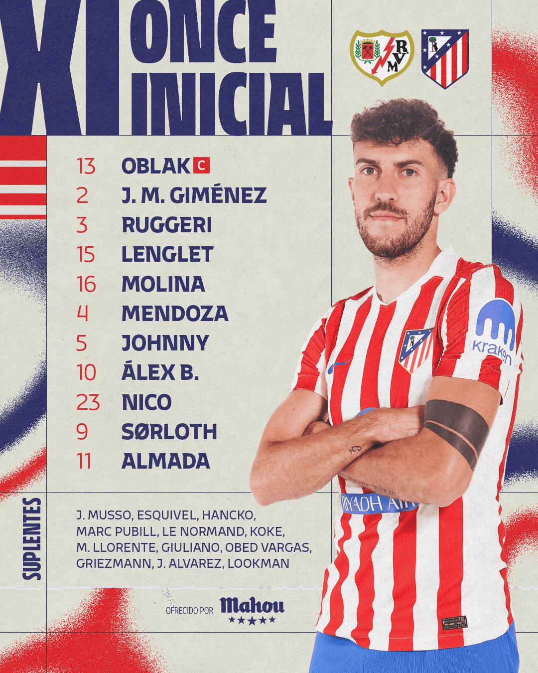马竞替补:1-穆索、31-埃斯基维尔/14-略伦特、17-汉茨科、18-普维尔、24-勒诺尔芒/6-科克、7-格列兹曼、21-巴尔加斯/19-阿尔瓦雷斯、20-朱利亚诺、22-卢克曼