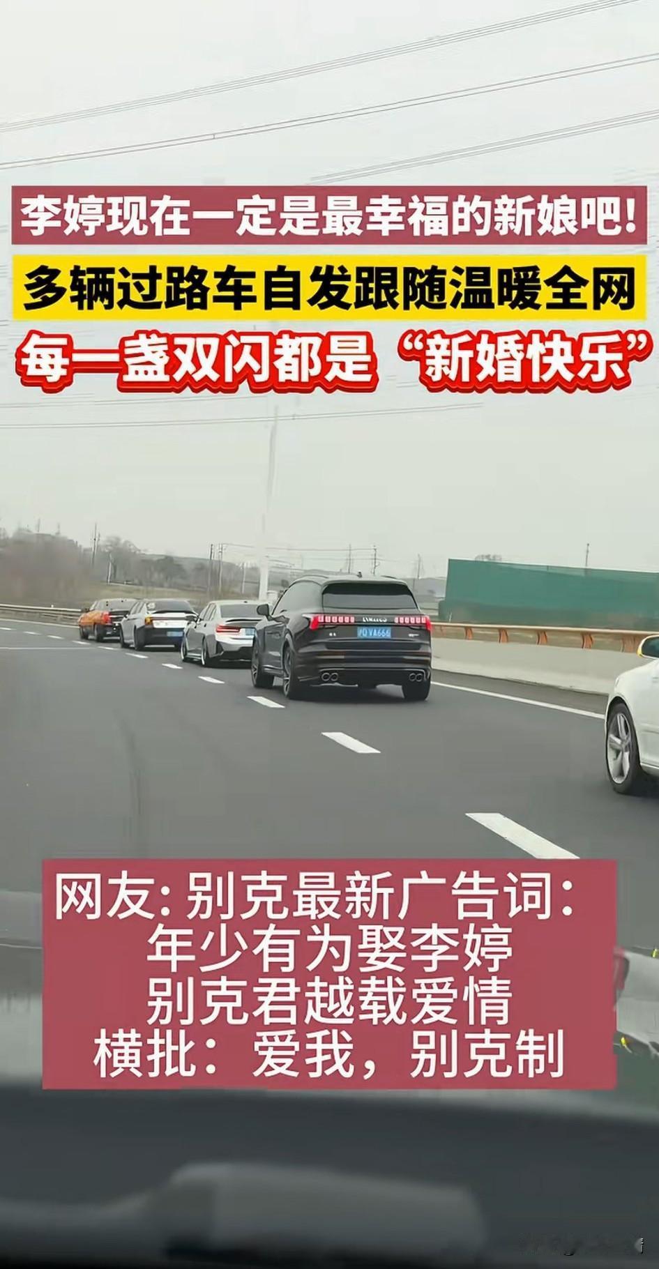 男子开着别克车娶老婆走在高速上, 车身上面拉了一个大横幅, 你是怎么知道我把李婷娶回家的? 这一幕被过往的车辆看见了, 大家询问过后才知道, 对方只有一辆婚车, 与视同行的司机纷纷跟在车的后面坐了婚车,还都打着双闪, 每一个双闪都代表了对李婷的祝福, 虽然大家不知道李婷是谁, 但是都希望她这个婚礼精彩, 这是直接上了热搜, 也顺便让别克做了一把免费的广告, 这回直接出现了李婷同款的轿车, 4s店都把这当做了一个宣传招牌, 别克老板更是大气, 直接宣布2月份订别克并且领结婚证的, 都可以给你1万元的现金奖励, 这破天流量算是被别克接住了, 网友总结的广告词更是经典, 年少有为娶李婷, 别克君越载爱情, 横批爱我,别克制! 大家觉得高速李婷婚车是不是最靓的车? 高速李婷婚车 李婷婚车 别克婚车 别克李婷 李婷车队