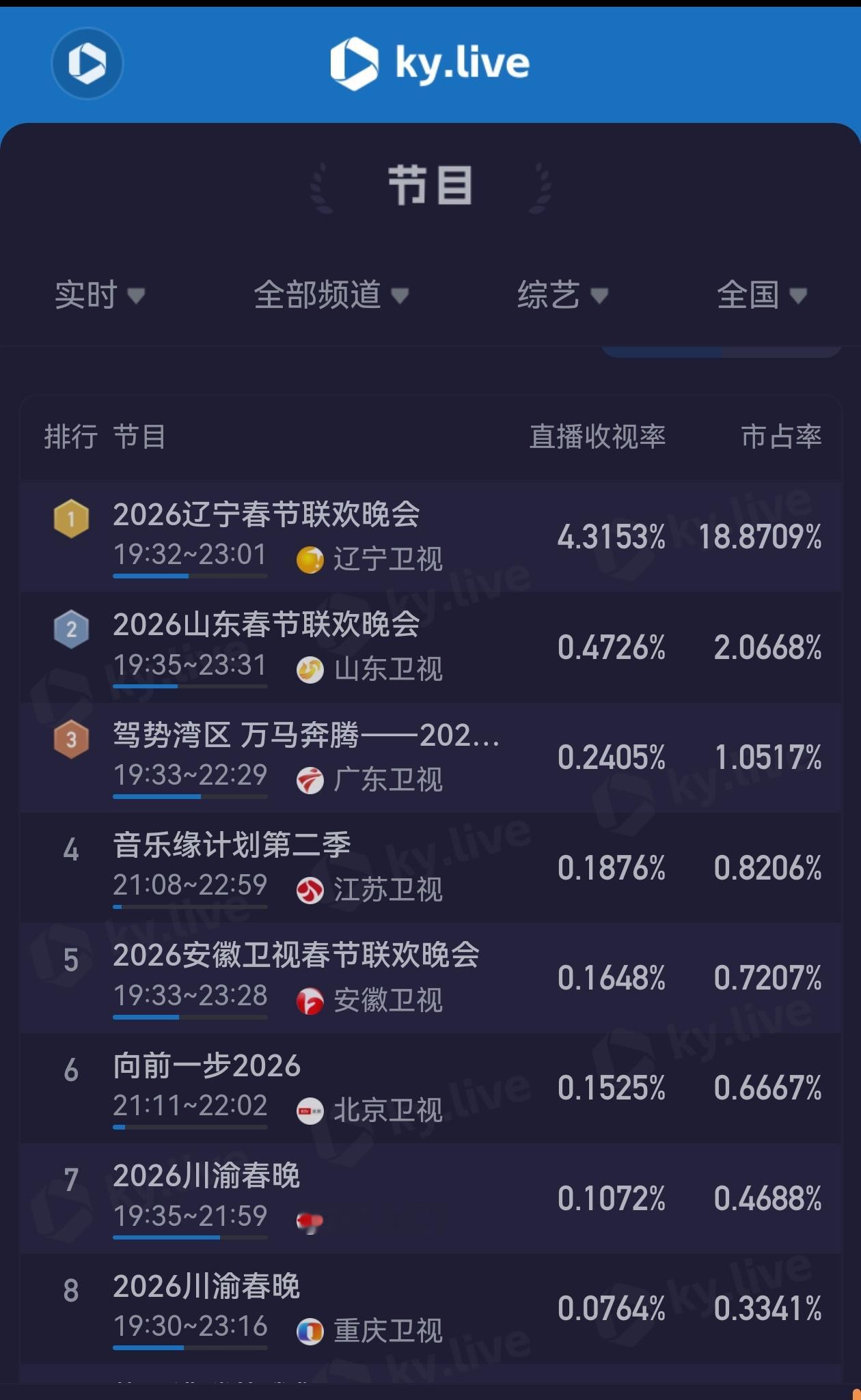 辽宁卫视春晚辽视春晚收视突破4.3。2026年卫视收视最高峰!今晚有5家卫视春晚同时竞争。