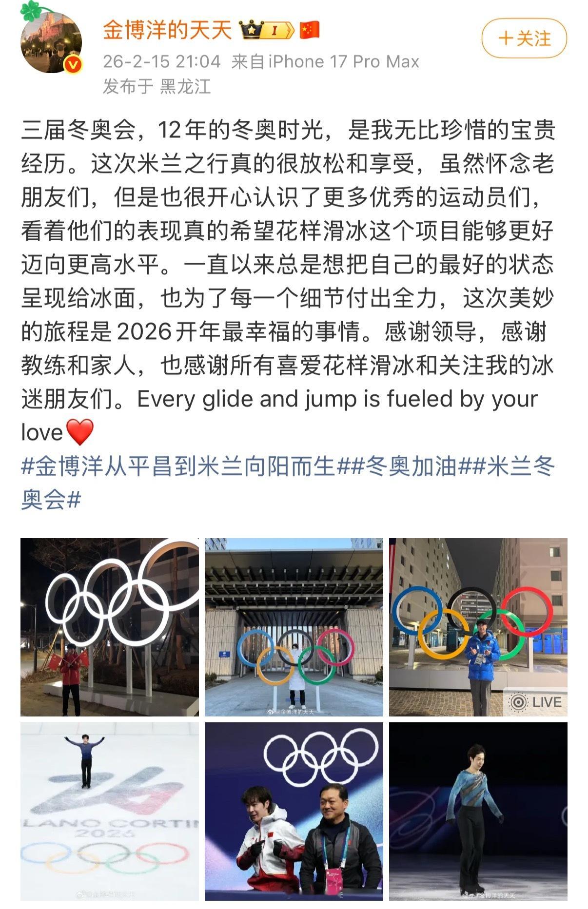 他还提到这次米兰之行真的很放松和享受,虽然怀念老朋友们,但是也很开心认识了更多优秀的运动员们,看着他们的表现真的希望花样滑冰这个项目能够更好迈向更高水平。一直以来总是想把自己的最好的状态呈现给冰面,也为了每一个细节付出全力,这次美妙的旅程是2026开年最幸福的事情。感谢领导,感谢教练和家人,也感谢所有喜爱花样滑冰和关注我的冰迷朋友们。Every glide and jump is fueled by your love❤️
