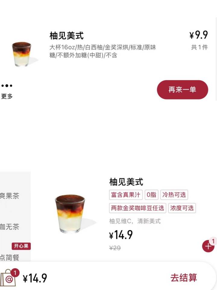 小乔常点的库迪柚见美式,价格由一个月前的9.9元涨到了现在的14.9元