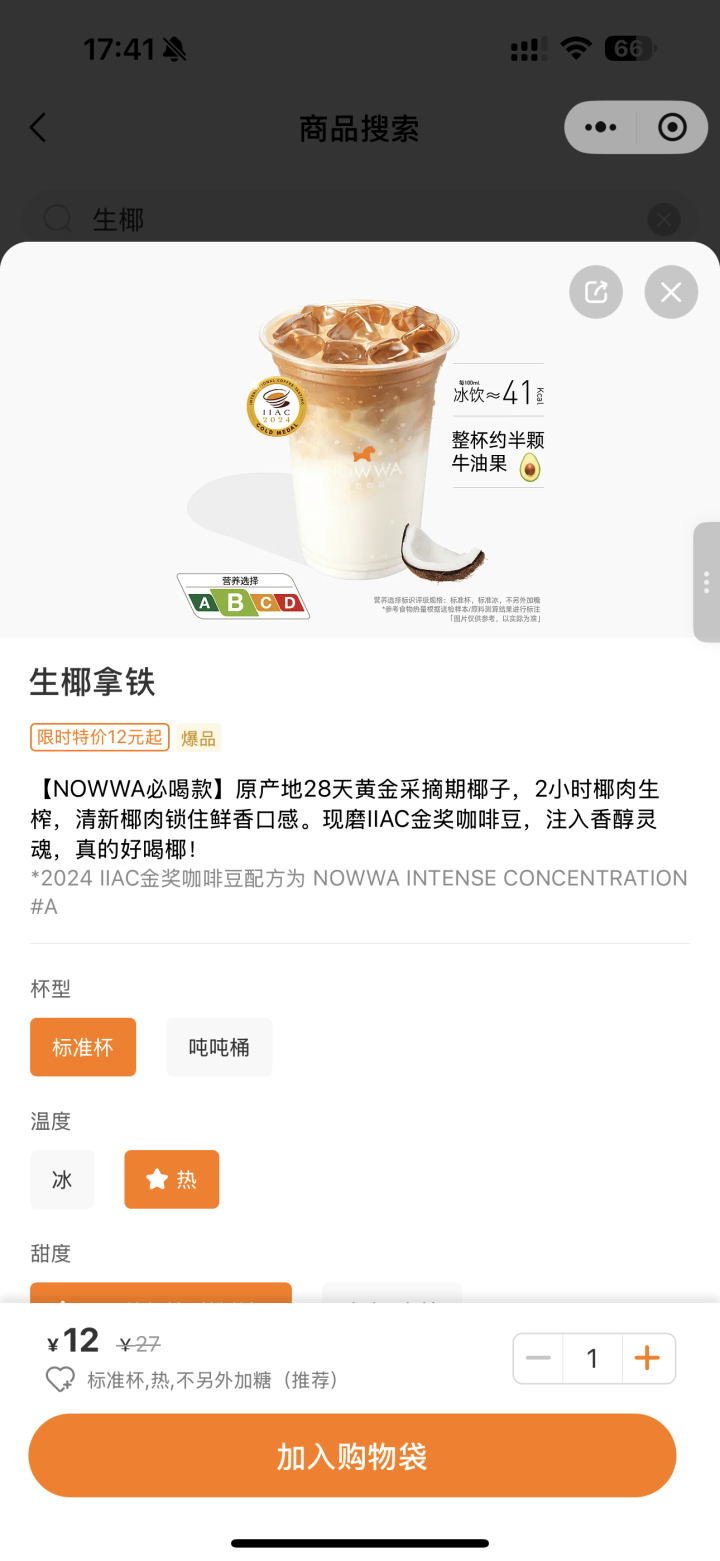 挪瓦咖啡的小程序上,也看不到之前8.8元的饮品了。记者打开品牌小程序点单发现,原来限时特价8.8元的生椰拿铁,现在到手价是12元。
