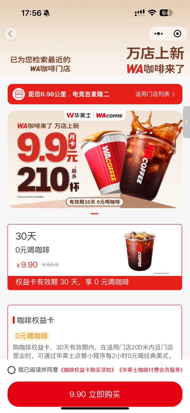 购买9.9元月卡后,消费者在三十天内,每隔两小时就可以到店领取一杯咖啡,单日领取上限为7杯。这意味着,购买月卡的消费者单月可在华莱士门店最多购买210杯咖啡。