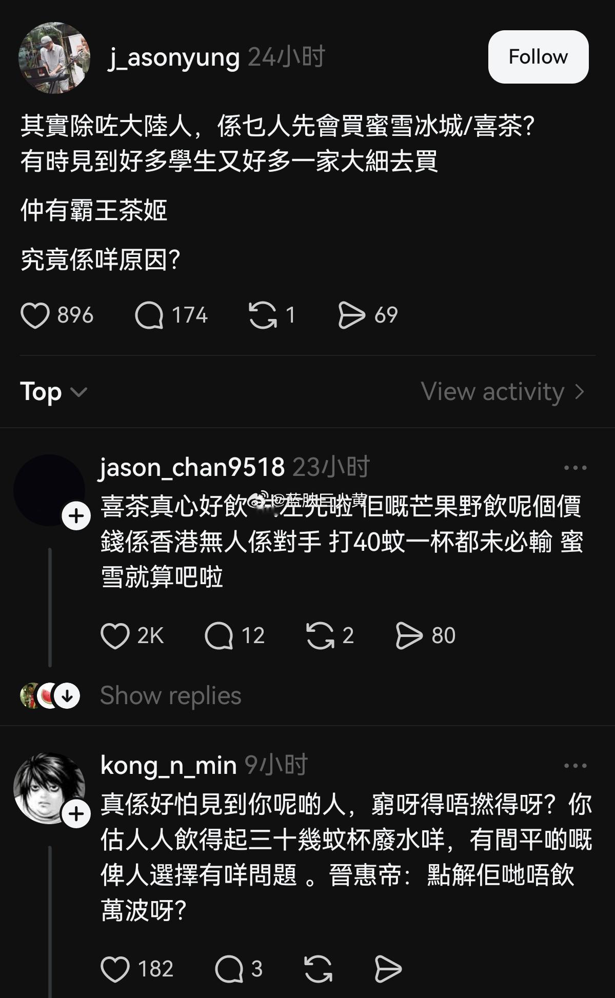 港人在外网上发帖困惑,“为什么香港有那么多学生和一家老小都在排霸王茶姬,喜茶和蜜雪冰城?”
