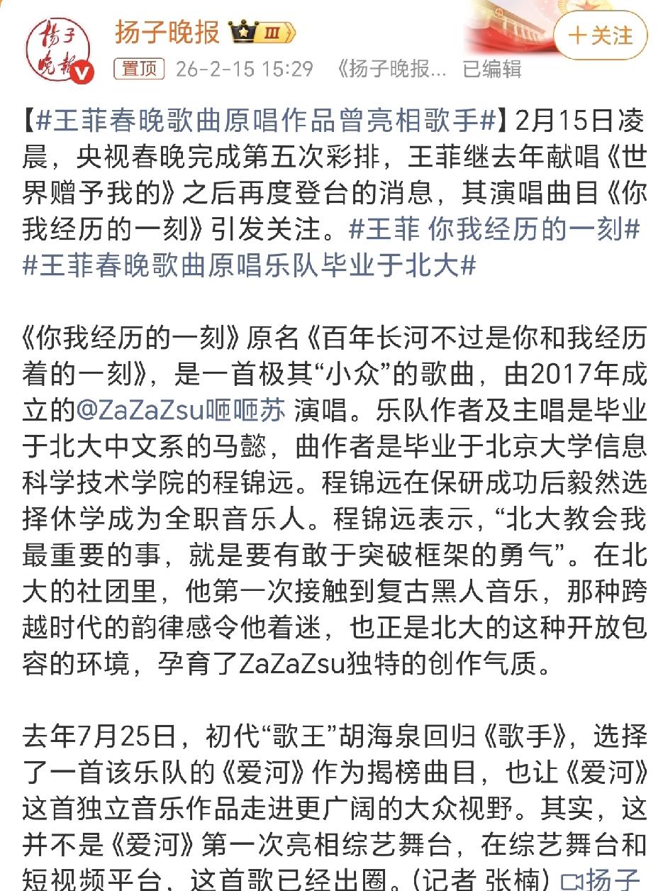 王菲是真牛,春晚歌曲未唱先火! 56岁王菲第六次登上春晚,观众们最关注的就是她要唱什么歌,本着她唱什么什么火的先例,这首《你我经历的一刻》这两天已经被刷爆了! 听来听去,怎么也不像能大火的歌曲啊。很小众的ZaZaSu,乐队,歌手,歌曲,都是鲜为人知的! 歌曲原名好长《百年长河不过是你和我经历着的一刻》,好深刻[捂脸]! 能够被王菲相中自有她的可取之处,期待菲姐再创造一个传奇吧!王菲 王菲传奇故事