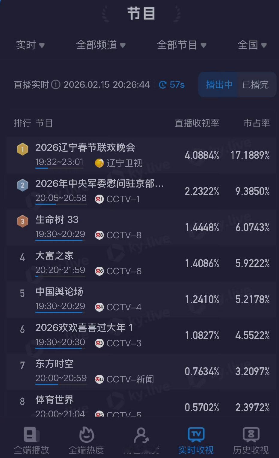 辽宁卫视春晚这个收视率好吓人,强烈建议其他地方卫视春晚不要选在农历二十八这天播出了,这是真打不过啊[捂脸]! 七点半开播后随着于适骑马上台收视直接登顶,收视率冲到4,市占率达到17%,终于明白为什么这么多年湖南卫视只播小年夜了,辽宁卫视等了一年,这一天的收视率可以骄傲一整年了! 真牛! 建议明年分会场还是来沈阳吧! 春晚收视率