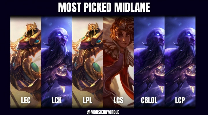 外媒统计各大赛区最多出场中单英雄:LPL钟爱沙皇,LCK瑞兹更多