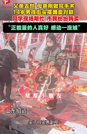 招远男孩卖春联这件事是烟台今年最让人感动的一件事,小男孩失去了父亲,母亲又在做手术,他没有自暴自弃反而自己出来自力更生买春联这是第一让人感动; 其次这个小男孩面对陌生好心人多给的钱没有接受,即便接受了赠送的牛肉依然选择包了饺子送给好心人,说明这个小男孩很懂的感恩,这是第二让人感动的! 第三就是招远这个城市行动起来,包括小男孩的同学在内的很多好心人都再帮他卖春联,很多人也来照顾生意买春联,大家都在尽微薄之力帮助这个小男孩,这是第三个让人感动的地方! 作为全国文明城市,这样的事迹在烟台反复出现,但是即便如此我们也应该大力宣传,因为这才是真正的大爱,这才是真正的文明!招远人在这个春节用实际行动让我们感受到了城市温暖和城市人与人之间的大爱!